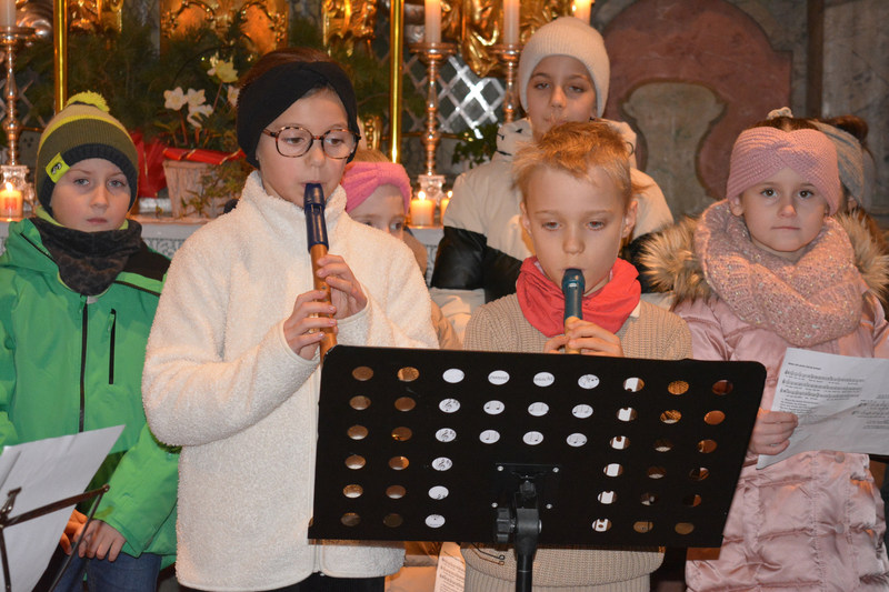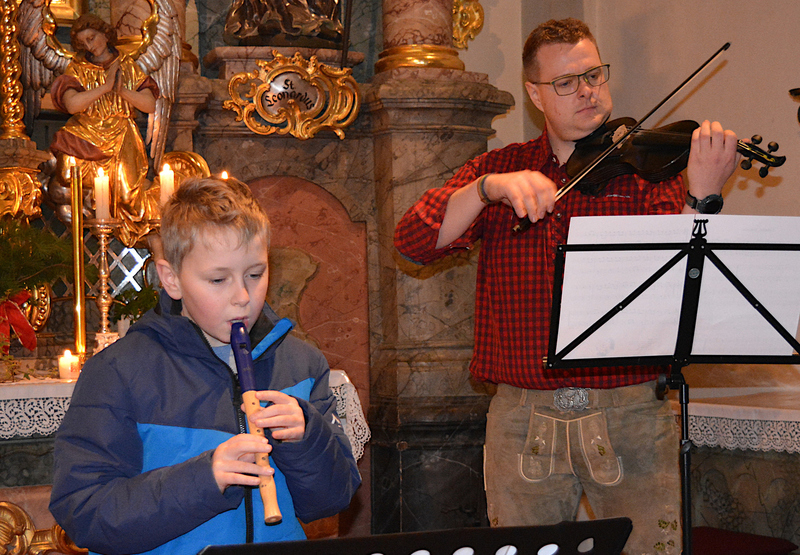 Mit den bekannten Melodien „Morgen kommt der Weihnachtsmann“ und „Ihr Kinderlein kommet“ eröffneten Elli Götz und Lias Lochner die