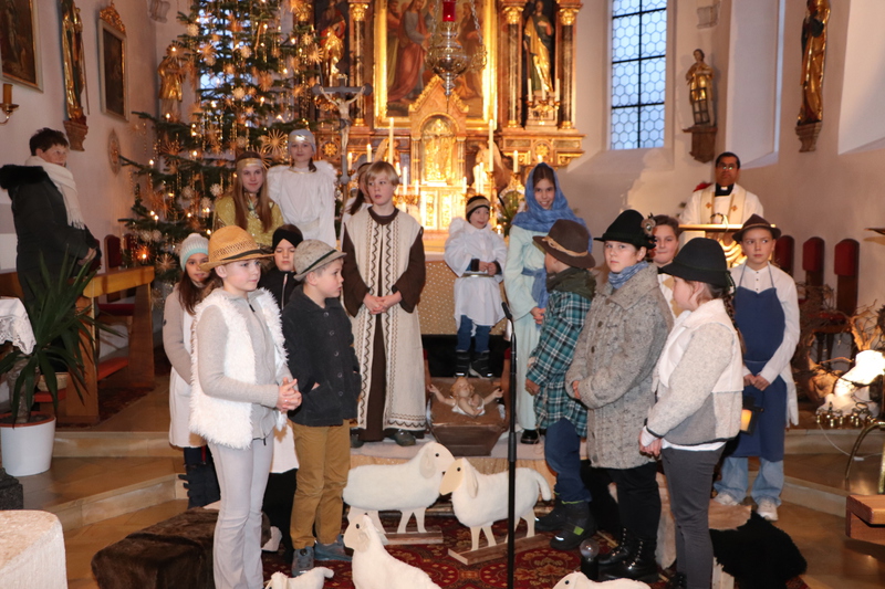 Zu dieser Zeit begaben sich die Engel (Anna Kastner, Tina Kammerl, Anna Schlagbauer, Elli Götz, Hanna Schwarzmeier, Ida Karg, Lena Kammerl, Leni Knödl und Josefa Feigl) zu den Hirten auf die Felder und verkündeten ihnen die frohe Botschaft. Auf dem Weg zur Krippe stießen die Hirten (Lias Lochner, Anton Hackner, Leo Götz, Maxi Meier, Florian Schlagbauer, Misha Berezovski und Sebastian Schuderer) auf einen Mann mit einer Krücke (Moritz Schneider), einen Bettler (Luca Legl) und eine Frau ohne Augenlicht (Emilia Fritz), die sie alle mitnahmen. Im Stall von Bethlehem angekommen, sangen alle gemeinsam Loblieder und ein paar Hirten erfreuten das Jesuskind mit ihrem Flötenspiel. Für ihre tadellosen schauspielerischen Leistung erhielten die jungen Akteure nicht nur den Beifall der Besucher, sondern auch noch einiges an Süßigkeiten.