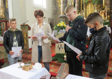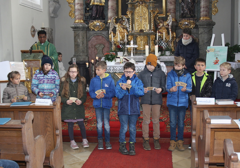 Anschließend beteten Jonas Wolfsmüller, Annalena Braun und Matthias Schuderer die Kyrierufe. Die von Karl Voreck vorgetragene Lesung stammte aus dem 1.Brief des Apostels Paulus an die Korinther. Dem Evangelium nach Matthäus lag das Thema Gerechtigkeit zugrunde. Danach stellten sich die Kommunionkinder einzeln vor und formulierten ihre Fragen. "Ich möchte wissen, was bei meiner Taufe geschah", fragte sich Philipp Frey, Emma Karg meinte: "Ich möchte gerne mehr über die Geschichte vom zwölfjährigen Jesus im Tempel erfahren" und Quirin Deisenrieder zeigte sich schon gespannt, wie wohl die erste Beichte ablaufen wird.