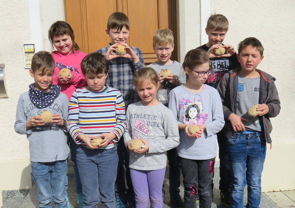 "Vom Weizenkorn zum Mehl - wie werden Körner zu Brot", lautetet das Thema der Wolfsbucher Kommunionkinder, die sich mit den Kommunioneltern zu einer gemeinsamen Tischrunde trafen. Dabei erfuhren die Buben und Mädchen alles über die Zutaten eines Teiges und schlüpften danach sogar selbst in die Rolle des Bäckers. Nach dem Backen durften die Buben und Mädchen ihre ganz persönlichen Brote mit nachhause nehmen und sich schmecken lassen.