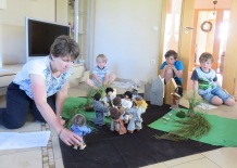 Im Mittelpunkt stand dabei die Geschichte "Der große Krach" - eine Erzählung über Karni und Nickel von Claude Boujon und Tilde Michels. Zum Inhalt, den einige Mütter vorlasen: "Auf der Wiese hatten sich zwei Kaninchen ihre Wohnungen dicht nebeneinander in die Erde gegraben. das eine hieß Karni und das andere Nickel.Zuerst verstanden sie sich gut. Eines schönen Tages aber ... nein, ein schöner Tag war das nicht. Es war ein ganz schlechter Tag, weil die beiden Kaninchen Streit bekamen. Als Karni aus seinem Loch schaute, sah er nämlich,dass Nickel seinen Abfall einfach auf die Wiese geworfen hatte. 'So ein Ferkel', schimpfte Karni. 'Räum sofort das Zeug weg !'.