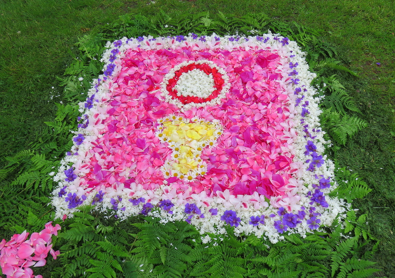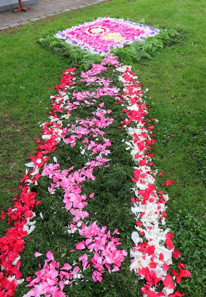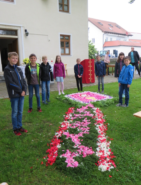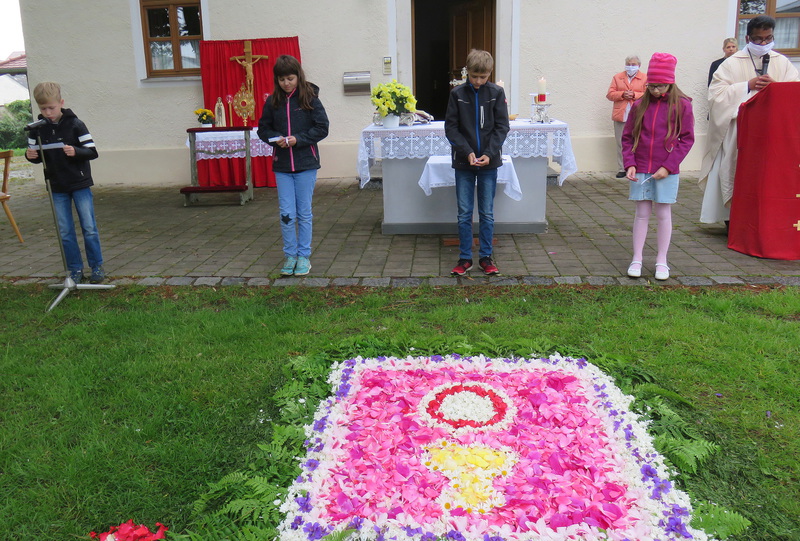 An zwei aufgebauten Altären betrachteten die Gläubigen vier unterschiedliche Lebensalter: den Lebensanfang, die Jugend, die Zeit des Erwachsenseins und das Alter. Die Kommunionkinder lasen einige Fürbitten. Zum Schluss knieten die Gottesdienstbesucher zur Aussetzung des Allerheiligsten nieder. Benedikt Stijns auf der Ziehharmonika und Simone Frey auf der Gitarre beendeten die Feier mit dem Lied "Großer Gott, wir loben dich". Die Kommunionkinder hatten einen prächtigen Blumenteppich gelegt.