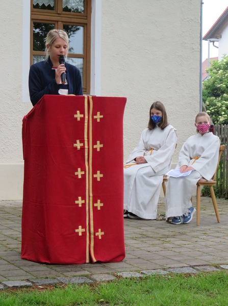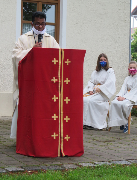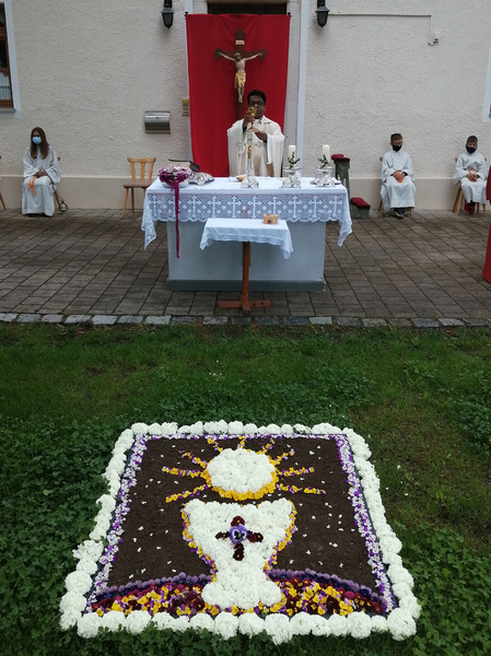 In der Tat - der Pfarrgemeinderat und das Liturgieteam hatten den Gottesdienst der Pfarrgemeinde Wolfsbuch aufgrund der Pandemie-Vorschriften lediglich in den Pfarrgarten verlegt. Und er wurde sehr gut angenommen, so dass die vorgegebene Höchstzahl an Teilnehmern erreicht, aber auch eingehalten werden konnte. Die Wolfsbucher Kommunionkinder hatten bereits im Vorfeld einen farbenprächtigen Blumenteppich gelegt, der viel Beachtung und Bewunderung fand.