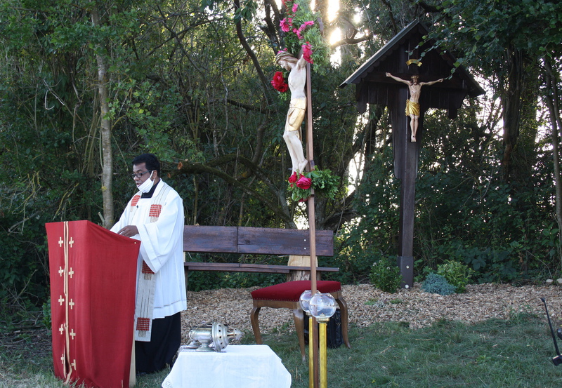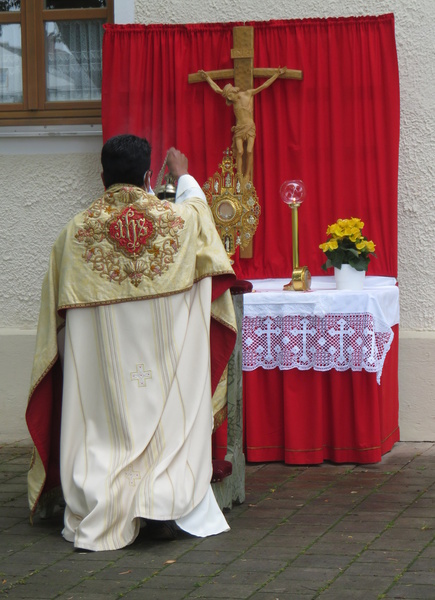 In seiner Predigt ging Pfarrer Matthäus auf die dreifache Bedeutung des Kreuzes ein: Werkzeug des Heiles, Lehrbuch des Lebens und Unterpfand unserer Hoffnung. "Das Kreuz ist ein Werkzeug des Heiles, da wir durch Jesu Leiden am Kreuz erlöst worden sind. Deshalb ist es uns Christen so lieb und so teuer", betonte der Ortsgeistliche. Das Kreuz sei aber auch ein Lehrbuch des Lebens. Aus ihm könne man viel heraus lesen - Erbarmen, Sanftmut, Armut. "Wir dürfen unsere Hoffnung nicht auf die Rettung im Gerichte setzen,sondern allein auf das Kreuz - allein auf das,was Gott in Jesus am Kreuze zu unserem Heil getan hat. Das Kreuz dient uns dabei als Unterpfand", merkte Pfarrer Matthäus zu seinem dritten Punkt an. Mit den aufmunternden Worten "Wenn der Feind uns bedrängt, wenn von allen Seiten die Versuchungen gegen uns anstürmen,wenn die Hoffnungslosigkeit uns überfallen will und Verzweiflung an uns zehrt, dann wollen wir uns an das Kreuz halten -die durchbohrten Hände des Heilands lassen uns nicht fallen" schloss der Geistliche seine Predigt ab.
