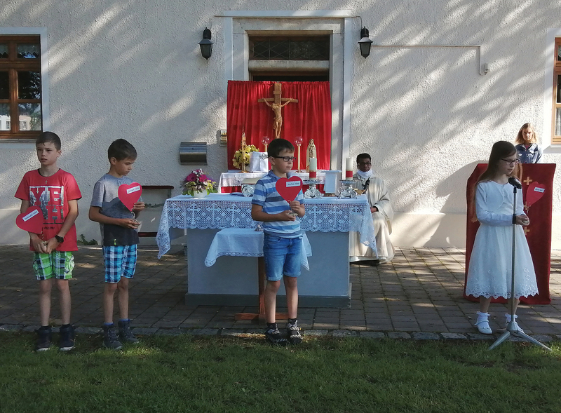 Die Lesung stammte aus dem Buch Deuteronomium, dem fünften Buch des Pentateuch. Das Evangelium trug Pfarrer Matthäus Luka nach Matthäus vor. Ein Herz in Bewegung, ein weites Herz und ein Herz ohne Bosheit brachten Franziska und Christiane vor den Altar. "Jesus, du hast auch ein offenes Herz für uns.Du möchtest uns Geborgenheit schenken. Wir aber meinen oft, dass wir dich nicht brauchen", hieß es in einem der Kyrie-Rufe, vorgetragen von Annika.