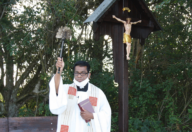 Zum Segnungsgebet besprengte Pfarrer Matthäus das neu errichtete Mertlbauerkreuz mit Weihwasser. Der Wortgottesdienst endete mit dem Lied "Großer Gott wir loben dich".