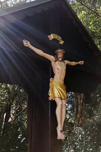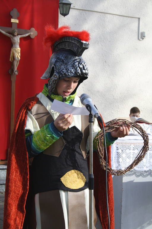 Der Kreuzweg beginnt in der Pfarrkirche. Schuderer stellt an der ersten Station fest, dass wir alle auf dem Weg des des Lebens sind. Jeder wünscht sich dabei, dass dieser Lebensweg glatt verläuft, dass man ihn ohne Hindernis gehen kann. "Aber in unserem Leben gib es auch Angst, Enttäuschung, Krankheit, Schmerzen und Traurigkeit. Unsere Wünsche und Pläne gehen oft nicht in Erfüllung - wir leiden", so Schuderer. Es folgt eine Legende aus dem Mittelalter in der Gott zeigt, dass das Kreuz, das jeder zu tragen hat, für ihn persönlich nicht zu schwer und auch nicht zu leicht ist. Bei der Station an der Marienkapelle werden die Leidenswerkzeuge betrachtet - Fesseln, Dornenkrone, Hammer, Essigschwamm, Lanze und Nägel . Aber auch die Würfel, mit denen "die Würde Jesus im Spiel verschachert wurde". Am Pfarrhof ist eine kindgerechte Szene mit Bibelfiguren aufgebaut. Sie zeigt Jesus, der das schwere Kreuz auf seinen Schultern trägt. Drei mit Lanzen bewaffnete Soldaten begleiten ihn auf dem schweren Weg nach Golgota. An dieser Station werden die Betrachter aufgerufen, sich Gedanken über Alter, Einsamkeit, Angst, Krankheit und Pflegebedürftigkeit zu machen: Wie wird es sein,wenn ich meinen Alltag nicht mehr alleine meistern kann ? Werde ich noch Freude am Leben haben ? Werde ich sagen können,das Leben ist trotzdem schön ?