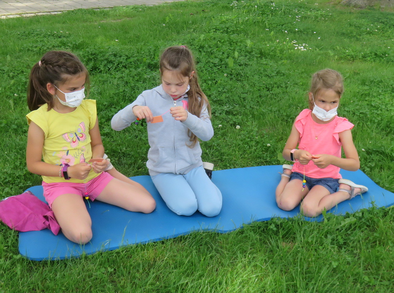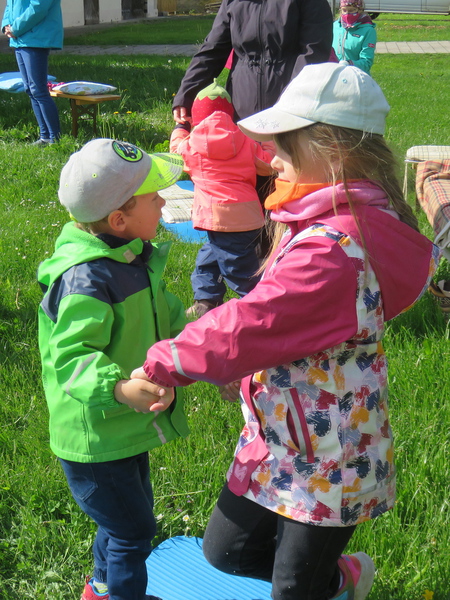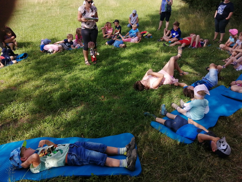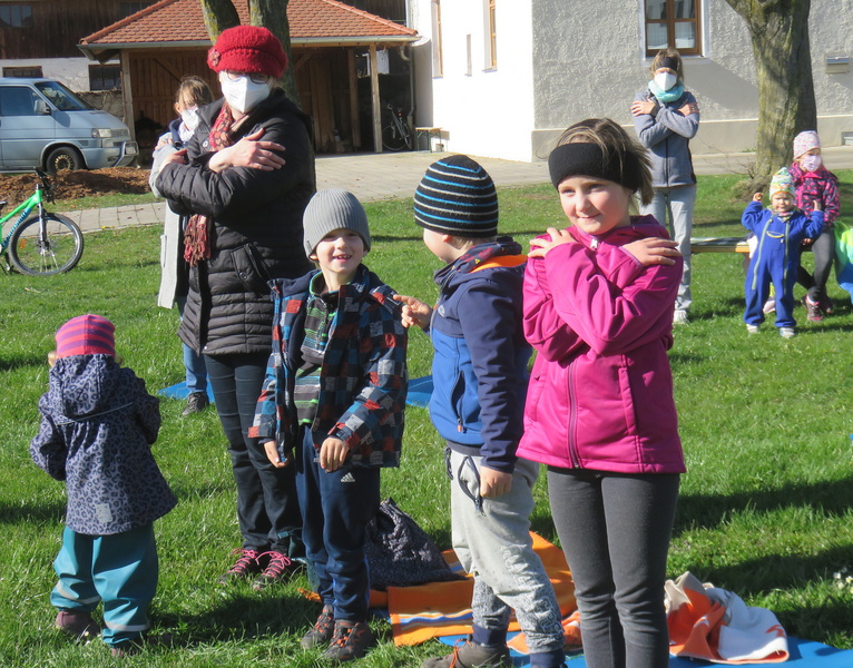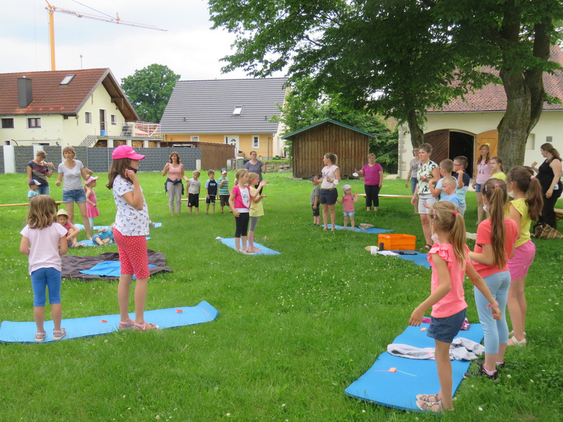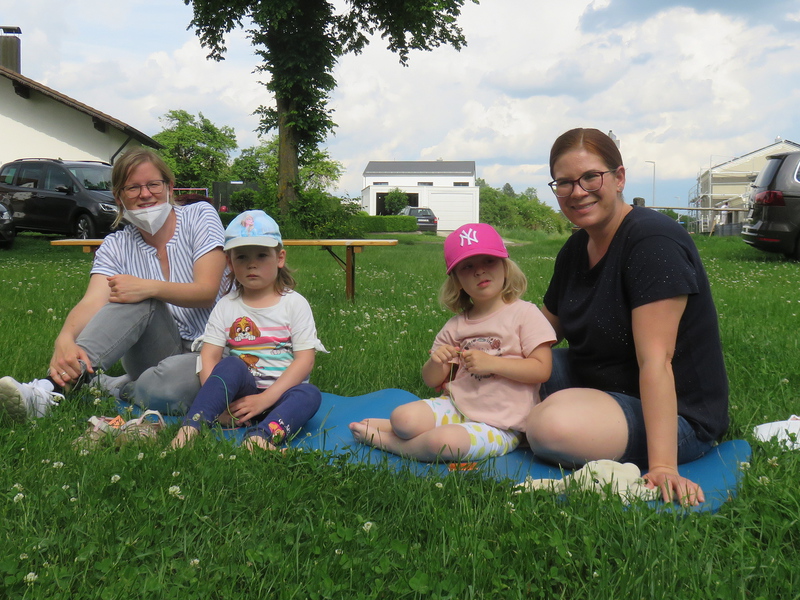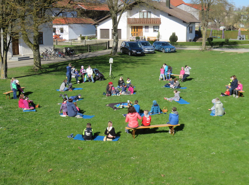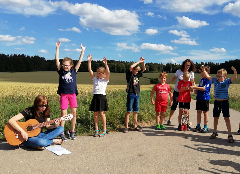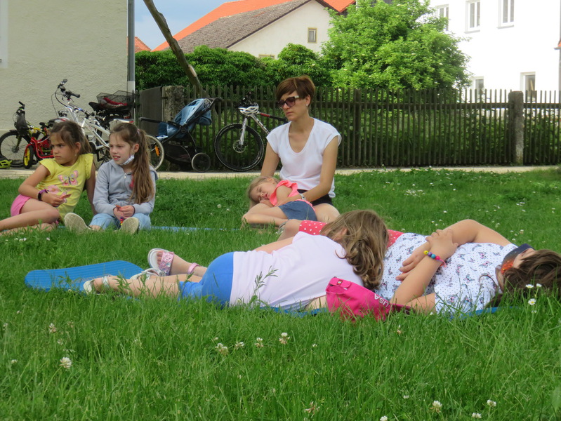 Bei der zweiten Station durften die Kleinen hüpfen, springen und ihre pure Lebensfreude zum Ausdruck bringen. Durch das gemeinsame Schwingen des großen, farbenprächtigen Tuches entstanden hohe und kleine Wellen. Zum bekannten Fliegerlied, das Simone Braun auf der Gitarre begleitete, wussten die Kinder sofort, welche Bewegungen gerade angesagt waren. Die Wiese vordem Eglersee bildete die dritte Station. Hier durften sich die Buben und Mädchen entspannen, indem sie die Augen schlossen und den Geräuschen der Natur lauschten. Anschließend falteten die Kinder die Hände zum Gebet und dankten Gott für die Insekten, die sie summen hörten und die Vögel, die laut zwitschernd ihre Lieder anstimmten.