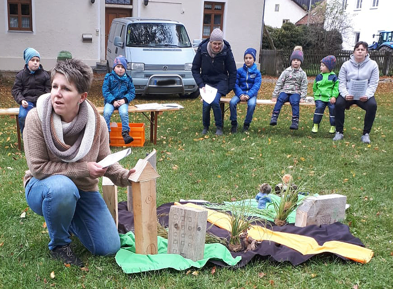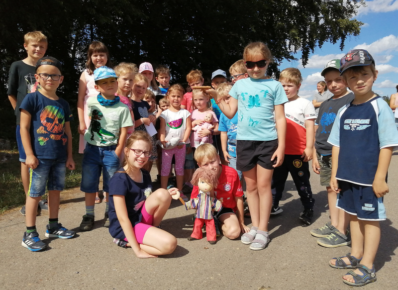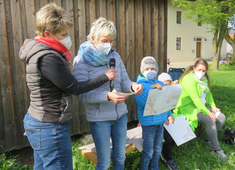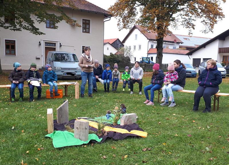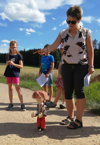 Hinaus in die freie Natur hatte diesmal das Wolfsbucher Liturgieteam die Buben und Mädchen zur Kinderkirche eingeladen. "Es ist schön, dass wir nach unseren Online-Angeboten wieder raus können", freute sich die Organisatorin Stefanie Schuderer. Ständiger Begleiter der Kinder war Fritzi, eine lustige Marionettenpuppe, die unter den Buben und Mädchen natürlich schnell Freunde fand.