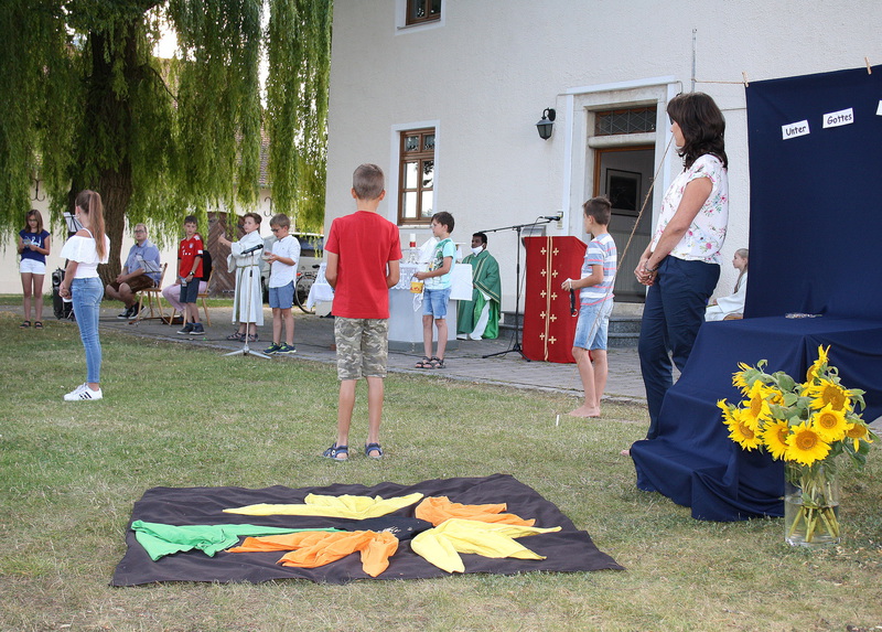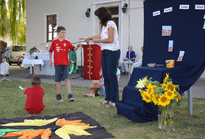 Einen Familiengottesdienst zu Beginn der Ferienzeit hatte das Liturgieteam der Pfarrgemeinde Wolfsbuch im schattigen Pfarrgarten vorbereitet. Das Thema lautete "Unter Gottes Sonne leben". Die Kinder trugen ein Sprechspiel vor.