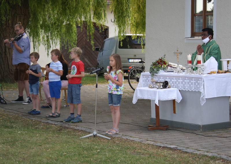 "Beginne du all meine Tage - sei du bei mir jeden Augenblick. Teile mit mir all meine Stunden - begleite mich durch Kummer und Glück". Mit diesem Lied von Martin Schraufstetter eröffneten Simone Braun auf der Gitarre und Benedikt Stijns auf der Geige unter dem frischen Grün des Blattwerk der mächtigen Weide den festlichen Gottesdienst im Freien. "Jesus, du bist tief in unseren Herzen, du begleitest uns - Jesus du bist immer bei uns", hieß es in den Kyrie-Rufen, die Matthias, Emma und Jonas vortrugen.