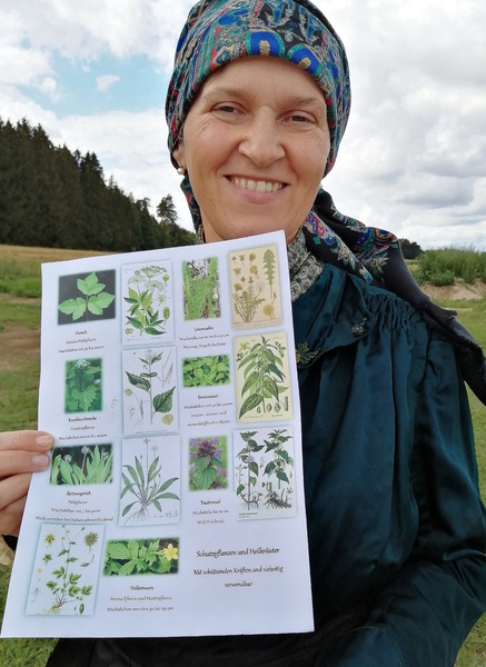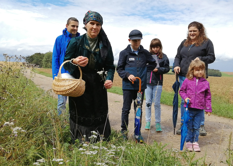 Im Abstand von jeweils einer halben Stunde machten sich die Familien nun auf den Weg. Tilia hatte es noch geschafft, verschiedene Hinweise Richtung Hauptquartier der Kobolde zu platzieren. An einigen Ästen und Zweigen der Bäume hingen zur Wegmarkierung Kärtchen mit den Abbildungen kleiner Trolle. Auf einer “verwunschenen Wiese” wurden die Teilnehmer von der Kräuterhexe (Luise Schweiger) empfangen. “Als erstes müsst ihr unbedingt die notwendigen Pflanzen für den Heiltrank suchen. Ihr habt nicht mehr viel Zeit, um die Natur von dem fiesen Zauber zu befreien”, trieb sie zur Eile an. Insgesamt benötigte man sechs Pflanzen , die unter Mithilfe der Kräuterfrau auch schnell gefunden waren.