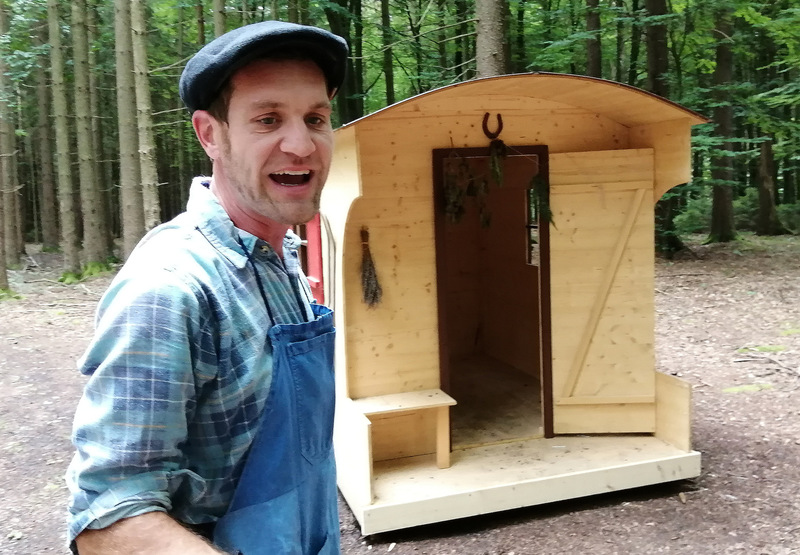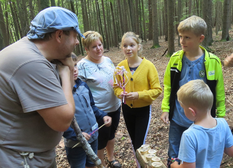Vor seiner Werkstatt trafen die einzelnen Familien auf einen magischen Schreiner (Benjamin Karg). “Um die Kobolde zu besiegen, braucht ihr einen guten Zauberstab”, betonte der freundliche Mann in Arbeitskleidung. Nun ging es ans Basteln des Stabes. Dazu stellte der Schreiner die verschiedensten Materialien zur Verfügung. Jetzt kam das Schwierigste – der Zauberspruch. Er beinhaltete die lateinischen Bezeichnungen für Wacholder, Löwenzahn und Holunder. Es galt sich daher folgenden Spruch zu merken: “Juniperus, Taraxacum, Sambucus – Kobolde verschwindet”.