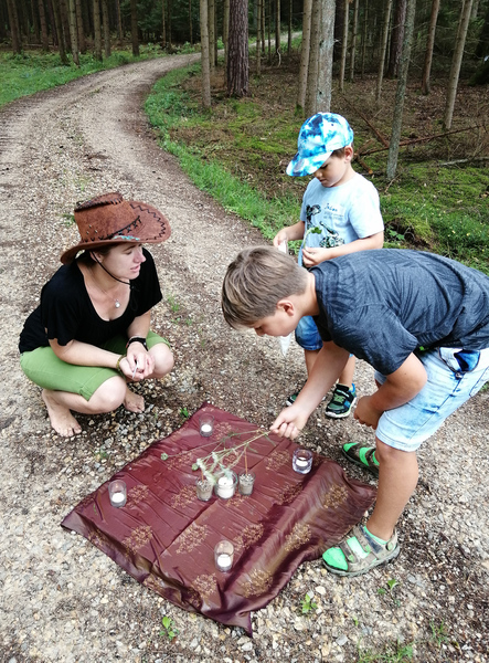 Bei der Guten Waldfee (Julia Pöppel) galt es zunächst ein Rätsel zu lösen, das vorher mit einer Lupe entziffert werden musste: “Er ist morgens ein Ei, mittags klein und Nimmersatt und abends fliegt er davon ?”. Nach längerem Grübeln und Nachdenken, kamen die Teilnehmer darauf, dass es sich dabei nur um den Schmetterling handeln konnte. Die Kinder durften nun aus Naturmaterialien einen Schmetterling legen. Die Gute Fee bedankte sich dafür und gab ihnen als “geheime Zutat” Schmetterlingsstaub mit auf den Weg.