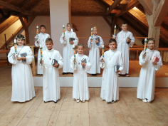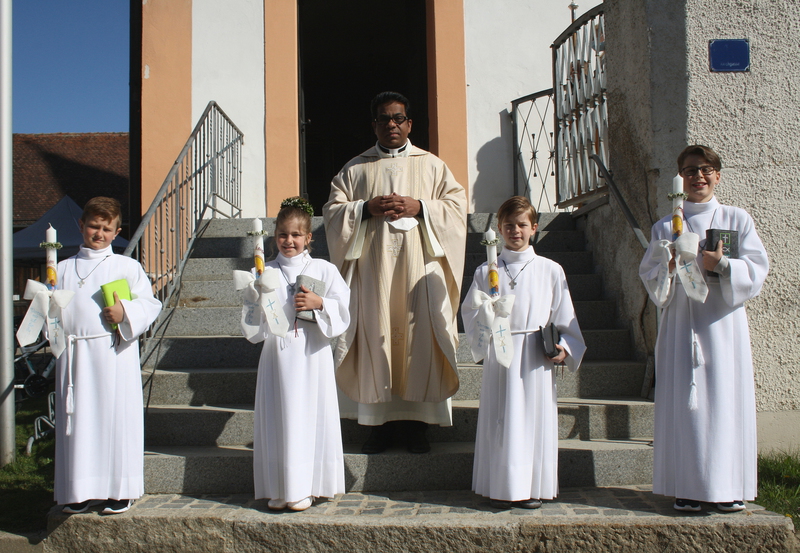 Während der Abendmesse am Samstag haben die Wolfsbucher Kommunionkinder die Kleidung für ihren großen Tag am kommenden Sonntag erhalten. Der Ortsgeistliche, Pfarrer Matthäus Luka, überreichte die Alben an Lousia Feigl, (von links) Severin Fehlner, Bastian Zanner und Luis Fehlner. Der Erstkommuniontag steht unter dem Motto "Vertrau mir, ich bin da". Die Messe beginnt um 10 Uhr in der Andreaskirche.