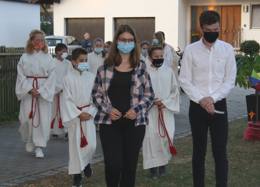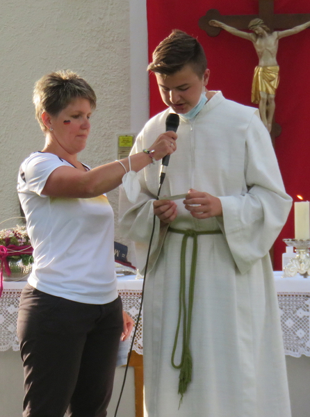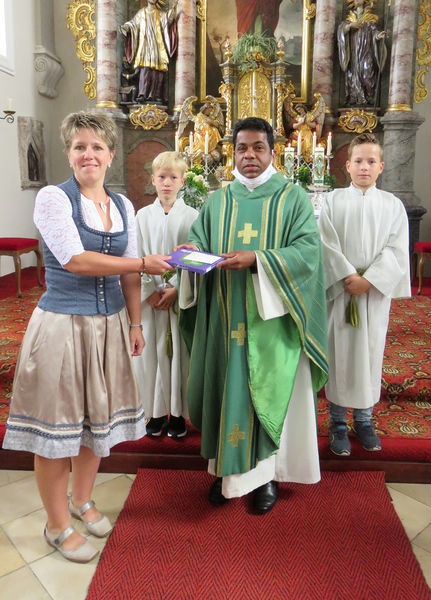 Nachdem Pfarrer Matthäus die Plaketten gesegnete hatte überreichte er sie an die neuen Ministranten Anna-Lena Braun,Quirin Deisenrieder, Tim Dürr, Philipp Frey, Emma Karg, Matthias Schuderer und Jonas Wolfsmüller. Die Eltern der neuen Ministranten bat der Geistliche, ihre Kinder bei der Ausübung ihrer Tätigkeit zu unterstützen. Der feierliche Gottesdienst endete mit einem Gruß an die Gottesmutter Maria.