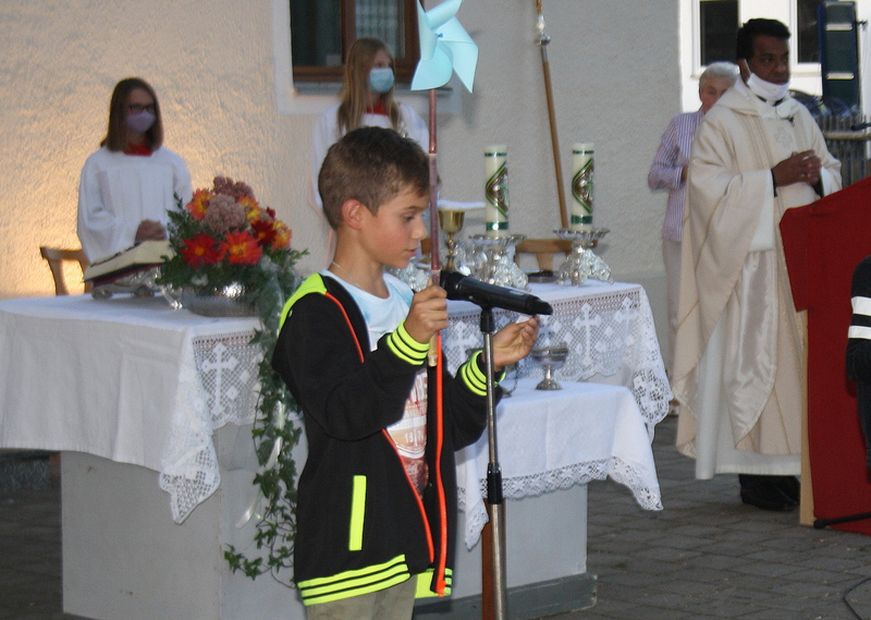 "Jesus, als deine Gemeinde sitzen wir alle in einem Boot. Du bist mitten unter uns und sagst 'habt Vertrauen'" ,hieß es in den Kyrie-Rufen der Kinder. Die Lesung stammte aus dem Buch der Korinther, das Evangelium trug der Ortsgeistliche nach Matthäus vor.