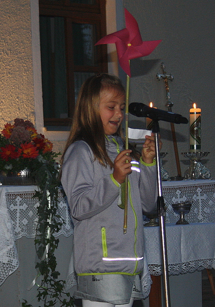 Nach dem Eingangslied, das Simone Braun und Benedikt Stijns wieder musikalisch begleiteten, erzählten die Kinder in einem Sprechspiel einiges über das Windrad. "Für unsere Gemeinschaft ist das Windrad ein schönes Bild. Wir Christen sind wie Flügel, die von Jesus Christus aus der Mitte gehalten werden",meinte ein Mädchen. Und ein Junge erinnerte an die Taufe, bei der man Teil dieses Windrades geworden sei. Als Flügel des Windrades braucht man einen festen Halt, konnten die Gottesdienstbesucher weiter erfahren. Im Zeichen des Brotes sei Jesus inmitten der Menschen und schenke ihnen Kraft, füreinander da zu sein. Auch die Fürbitten und Kyrierufe der Kinder hatten das Thema Windrad als Inhalt.