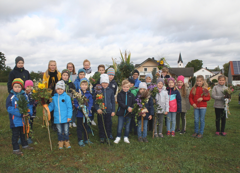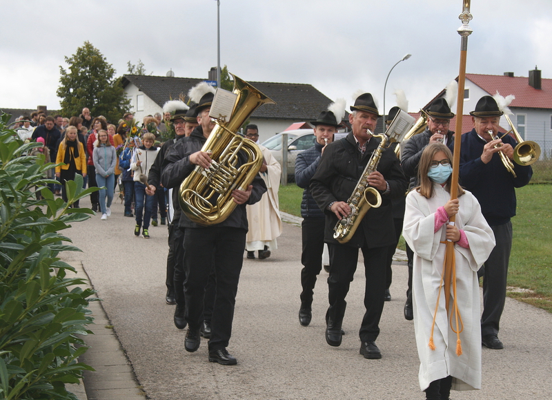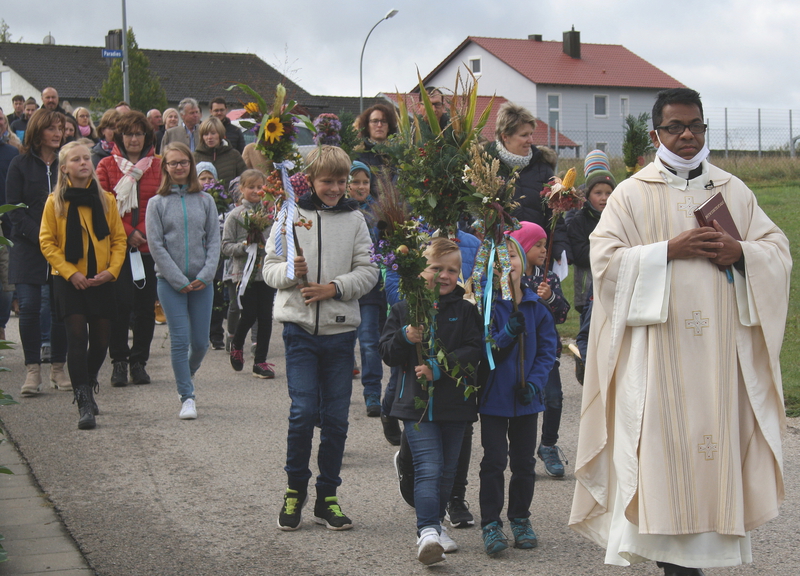 Beim Erntedankzug zum Pfarrgarten gaben die Kinder mit ihren bunten Stecken ein farbenfrohes Bild ab. Den Kirchenzug führten die Wolfsbucher Blaskapelle und der kirchliche Dienst mit Pfarrer Matthäus Luka an.