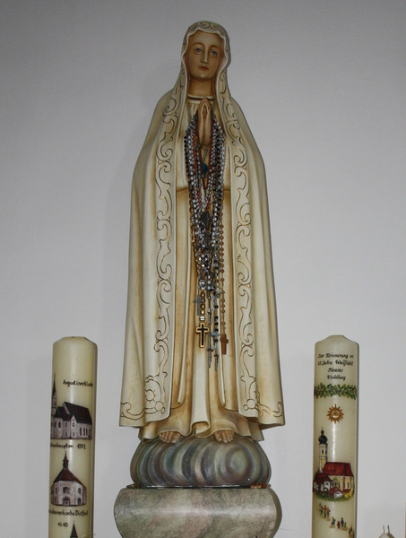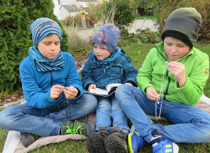 Zum Ende des Monats Oktober hat sich auch die Kinderkirche in Wolfsbuch diesem Thema angenommen. Die Kinder trafen sich dazu mit einigen Müttern im Pfarrgarten. Ein kurzer Film erklärte den Buben und Mädchen die einzelnen Gebete des Rosenkranzes. Die Initiatorin Stefanie Schuderer erläuterte dazu, dass die Rosenkranz-Kette aus einem Kreuz, sowie 59 kleinen und großen Perlen besteht: "Sie sind so aufgefädelt, dass immer drei kleine, eine große und wieder drei kleine Perlen aufeinander folgen. Und das Kreuz steht für das Glaubensbekenntnis".