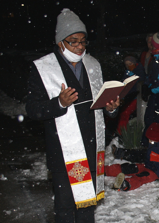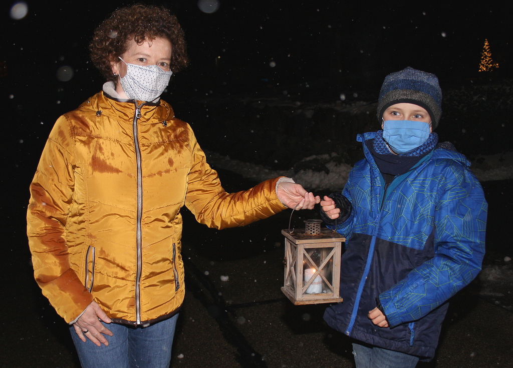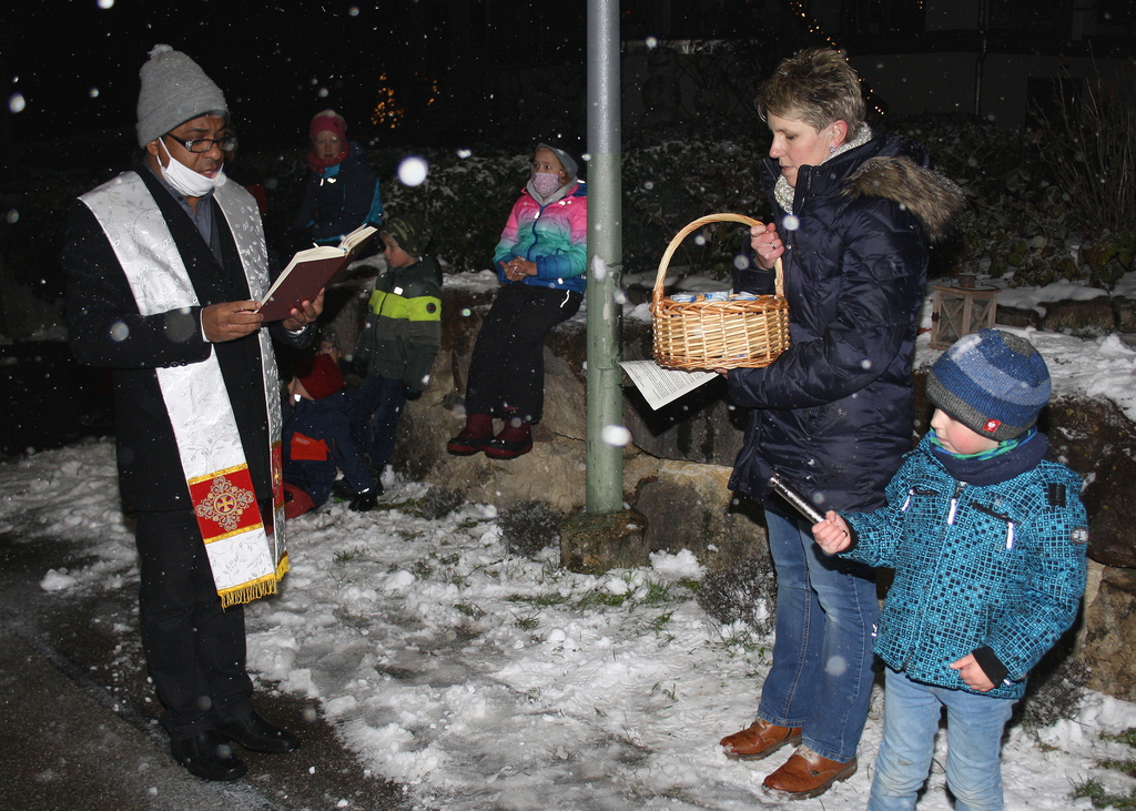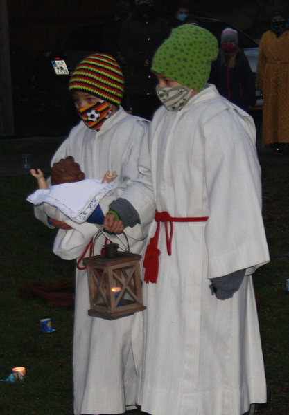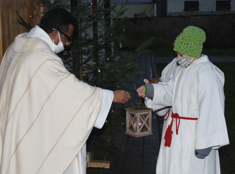 In seiner Predigt verglich Pfarrer Matthäus das Kind in der Krippe mit einem aufgegangenen Stern: "Sein Licht schenkt uns Hoffnung und Freude - gerade auch in dieser schweren Zeit der Pandemie. Das Jesuskind zeigt uns einen Weg aus der Dunkelheit ins Licht. Wir wollen in seinem Licht leben und durch das Kind selbst zu hellen Sternen werden, die anderen Licht und Freude bringen". Ein Ministrant überreichte dem Geistlichen in einer Laterne das Friedenslicht.
