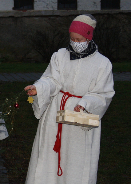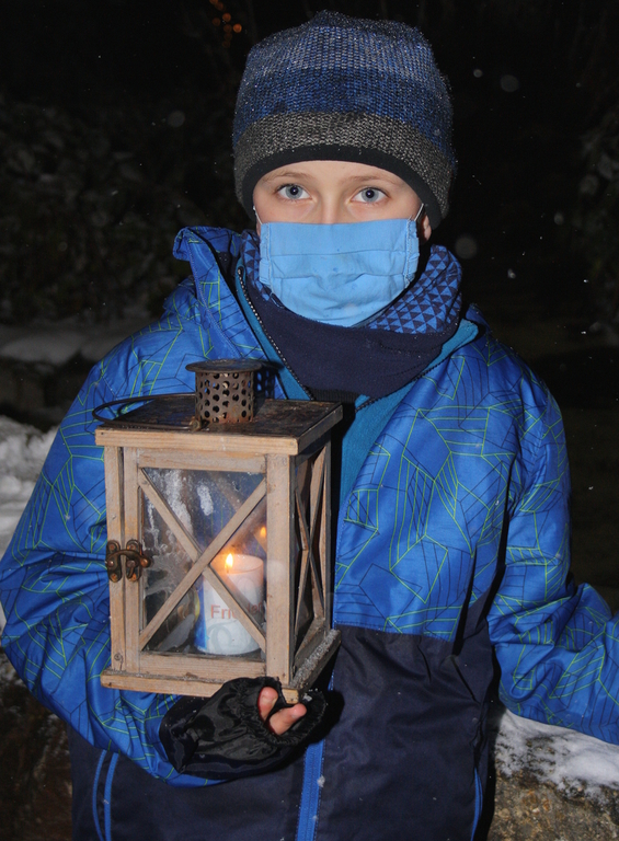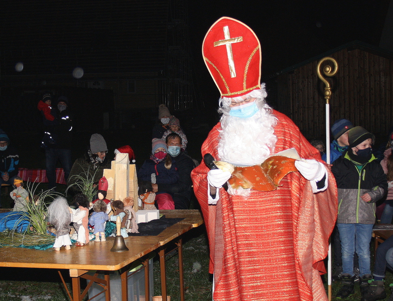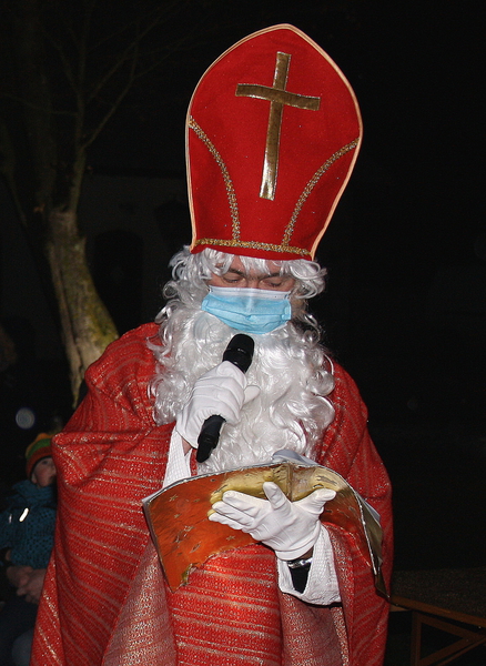 Nach dem Lied „Lasst uns froh und munter sein“ gesellte sich noch der „echte“ Nikolaus (Bernhard Pöppel) zu den Kindern. Um den Schutzmaßnahmen gerecht zu werden hielt er heuer allerdings den nötigen Abstand und trat mit Mundschutz auf. Zum Schluss durfte noch das beleuchtete Fenster mit der Nummer sechs des Pfarrhofs bewundert werden.