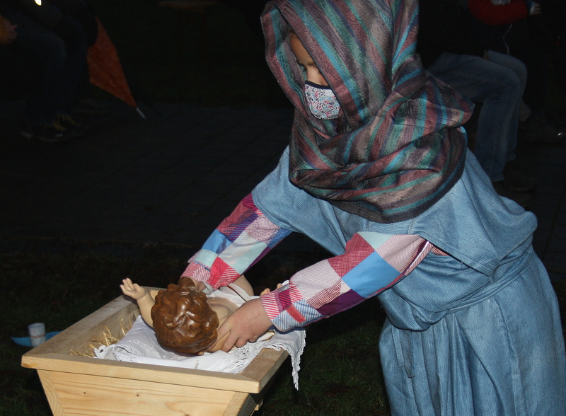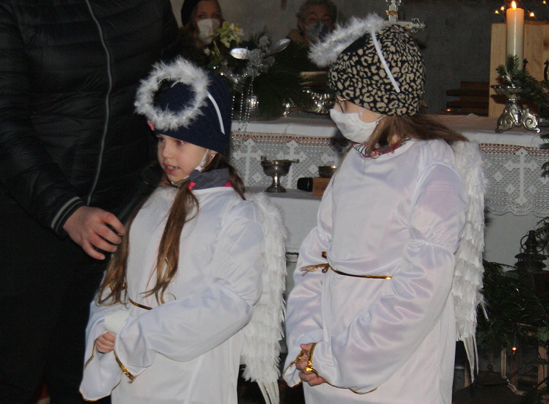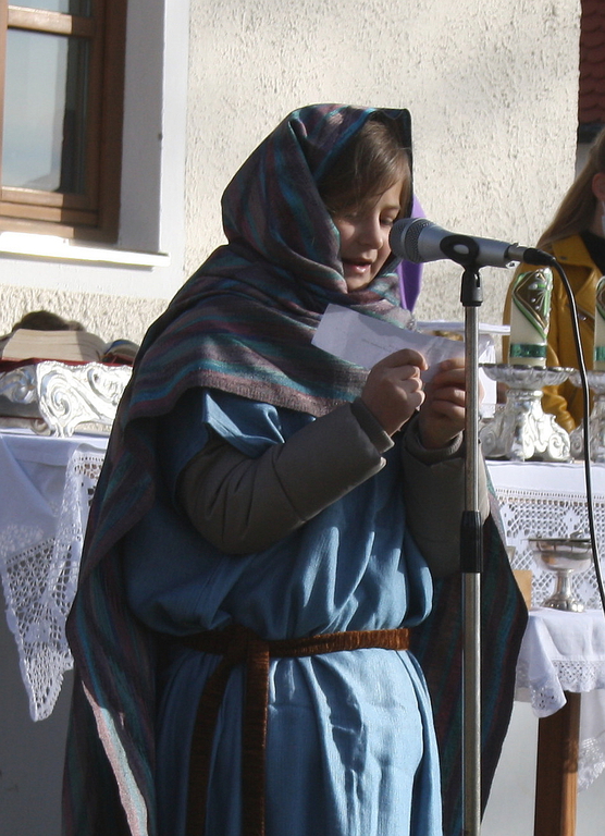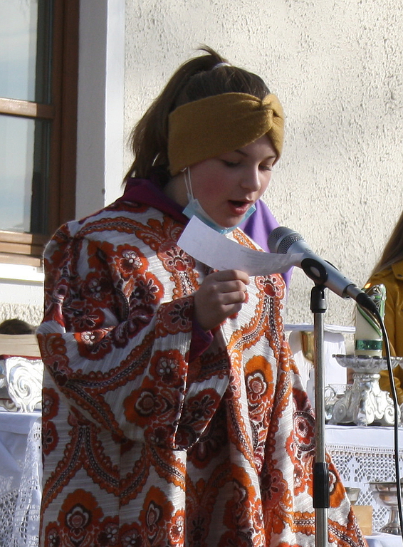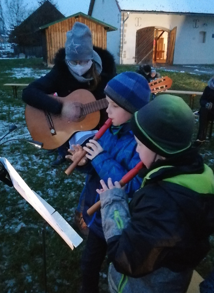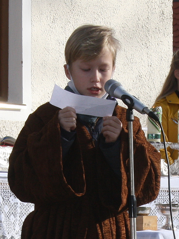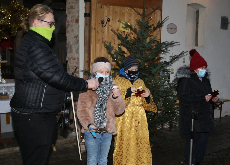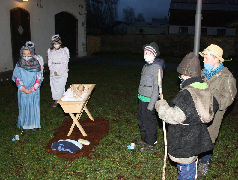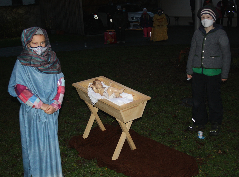 Da ja bekanntlich nicht gesungen werden durfte, umrahmten Matthias und Johannes Schuderer auf der Flöte und Benedikt Stijns auf der Geige die Messe mit ihrer stimmungsvollen Musik. Zur Einstimmung auf die Christmette erzählten Lea, Ronja, Annika und Sarah die Weihnachtsgeschichte aus der Sicht eines Christbaums. Anschließend wurde das Bäumchen mit verschiedenen Sternen geschmückt - einem Stern der Freude, einem Stern des Lichts und einem Stern der Hoffnung. Das anschließende Evangelium, vorgetragen vom Ortsgeistlichen Pfarrer Matthäus Luka, berichtete von der großen Volkszählung, dem langen Marsch von Maria und Josef und der Geburt Christi im Stall von Bethlehem.
