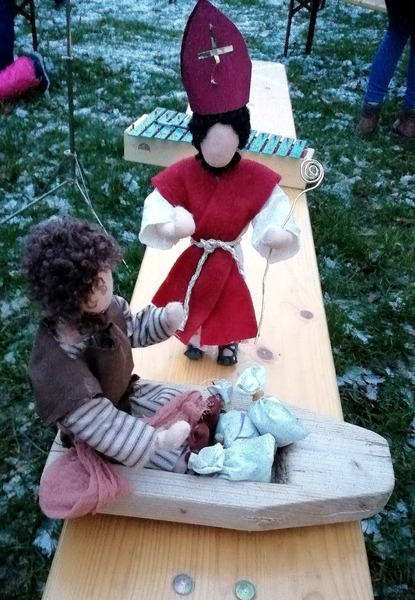 Auch das Liturgieteam der Pfarrgemeinde Wolfsbuch unter der Leitung von Stefanie Schuderer hatte hinter das sechste Fenster des Wandernden Adventskalenders etwas ganz Besonderes gelegt. Als offenes Fenster gestaltet wurde im Freien des Pfarrgartens unter Einhaltung der Corona-Schutzmaßnahmen ein kleines Rahmenprogramm geboten. Nachdem bereits der zweite Adventsonntag angebrochen war, durften zu Beginn auch zwei Strophen des Lieds “Wir sagen euch an, den lieben Advent” gesungen werden. Nach dem Anzünden der Jesuskerze ging Schuderer näher auf den Bischof Nikolaus ein. Sie hatte den Heiligen als Bibelfigur in Miniaturformat mitgebracht.