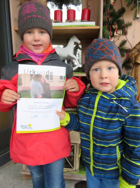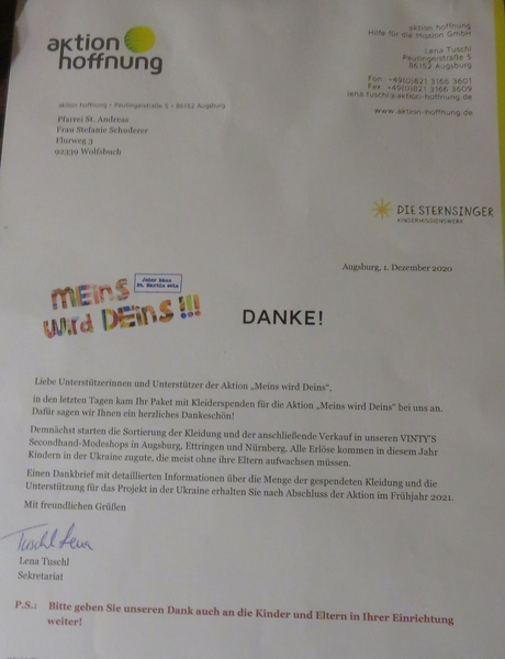Die Kinder der Pfarrgemeinde Wolfsbuch haben sich heuer an der Aktion Hoffnung unter dem Motto "Meins wird Deins - jeder kann Sankt Martin sein" des Kindermissionswerks beteiligt. Nach der Kinderkirche am Martinstag hatte das Liturgieteam zur Spende von gut erhaltener Kleidung aufgerufen. Das Paket mit der gesammelten Kleidung brachte anschließend 8,8 Kilogramm auf die Waage. Die Kleidungsstücke wurden anschließend sortiert und in Secondhand-Modeshops in Augsburg, Ettringen und Nürnberg verkauft. der Erlös aus diesem Verkauf kam Kindern in der Ukraine zugute, die meist ohne ihre Eltern aufwachsen müssen. "So wurde Kleiderspende zu Geldspende. Wir haben nun vom Kindermissionswerk für unsere Martins-Aktion eine Dankesurkunde erhalten. Das tut echt gut, eine solch nette Resonanz zu erhalten", freute sich die Sprecherin des Pfarrgemeinderates und Initiatorin Stefanie Schuderer. Sie gab diesen Dank im Rahmen der Kinderkirche zu Sankt Nikolaus gerne an die teilnehmenden Familien der Ortschaft weiter.