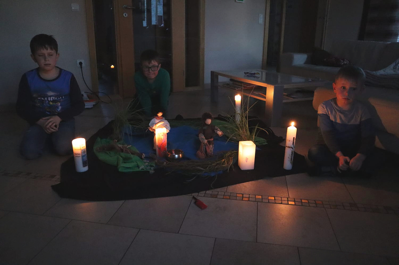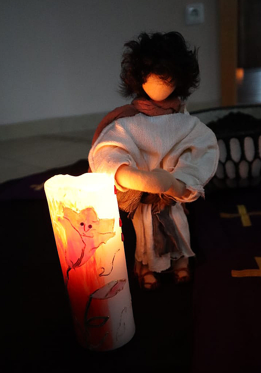 Dabei ging die Leiterin Stefanie Schuderer vor allem auf das Element Wasser ein. Die Buben und Mädchen durften zuhause vor den Bildschirmen zunächst ein blaues Tuch auf und ab bewegen und so die Bewegungen der Wellen imitieren. Danach erzählte Schuderer den Kindern die Geschichte von der Taufe Jesu durch Johannes im Jordan. Die Leiterin des Liturgieteams stellte dazu einige Bibelfiguren auf. "Als Jesus wieder aus dem Wasser stieg, passierte etwas Wunderbares - der Himmel ging über ihm auf. Über ihm wurde es hell und Licht", erzählte Schuderer weiter. Dazu entzündete sie eine Kerze und stellte sie in das Wasser. Laut Bibel senkte sich anschließend der Heilige Geist in form einer Taube auf den getauften Gottessohn. Und eine Stimme sagte: "Du bist mein Sohn - ich habe dich sehr lieb".