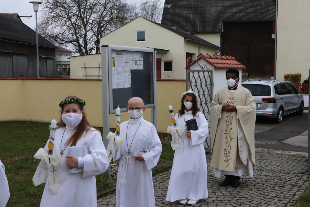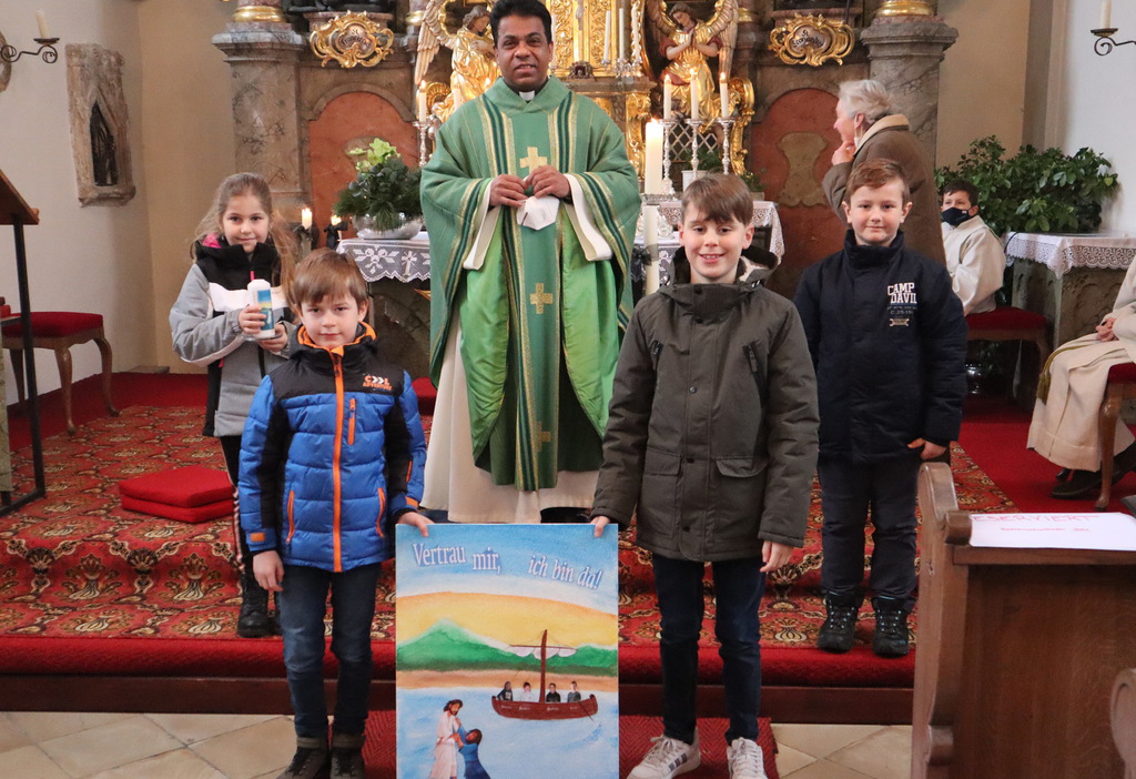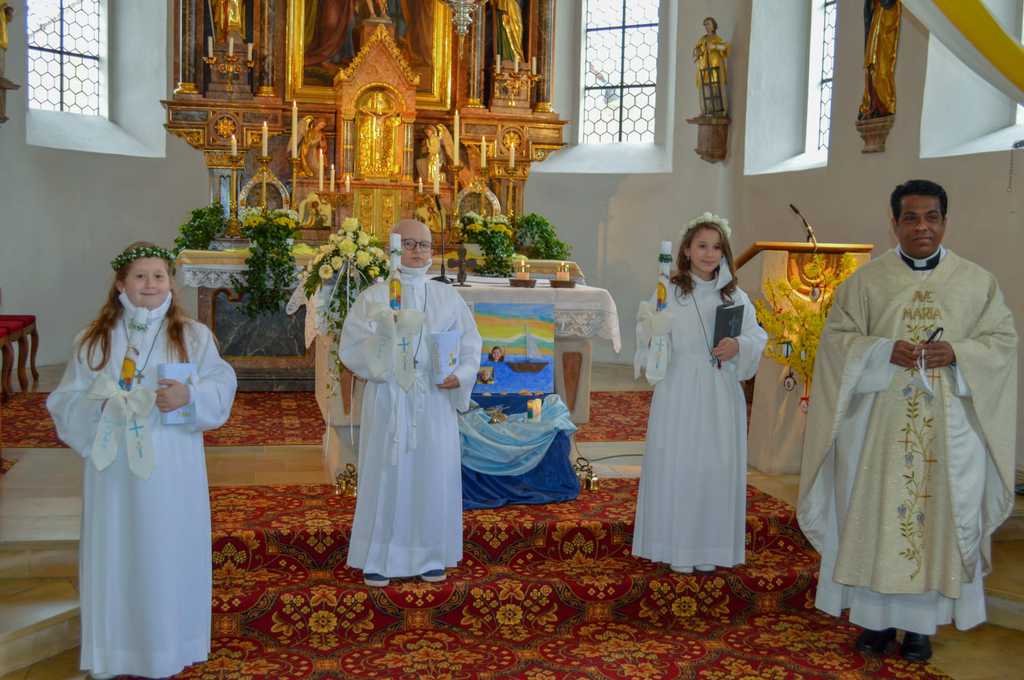 "Ohne Vertrauen können wir nicht leben. Häufig vertrauen wir fast schon instinktiv. Wir überqueren den Zebrastreifen und vertrauen darauf ,dass die Autos halten.Wir setzen uns in ein Flugzeug und vertrauen, dass der Pilot uns sicher ans Ziel bringt", betonte Pfarrer Matthäus. Der Glaube, sich auf jemand verlassen zu können, präge das ganze Leben. Dieser Glaube sei auch der Grundstein für die Beziehung - der Beziehung zu den Mitmenschen und der Beziehung zu Gott. "Es ist gut, darauf vertrauen zu dürfen, dass Gott bei uns ist. Er streckt uns in den Stürmen unseres Labens die Hand entgegen", so der Geistliche . Besonders greifbar und erfahrbar werde die Gegenwart Gottes in dieser Welt in den eucharistischen Gaben von Brot und Wein. Es folgte die Erneuerung des Taufversprechens. Anschließend übergaben die Kinder ihre Kerzen an Pfarrer Matthäus, der sie an der Osterkerze entzündete. Zur Gabenbereitung trugen die Kommunionkinder das Kreuz, die Gruppen-Kerze, die Hostienschale und den Kelch vor den Altar. Danach durften Luis Fehlner, Severin Fehlner, Louisa Feigl und Bastian Zanner erstmals erstmals die heilige Kommunion empfangen. "Jesus, nun bist du mein bester Freund. Jetzt bin ich mit dir vereint. Auf dich, da kann ich immer bauen, gibst mir auf ewig dein Vertrauen", beteten die Kinder am Schluss des Gottesdienstes.