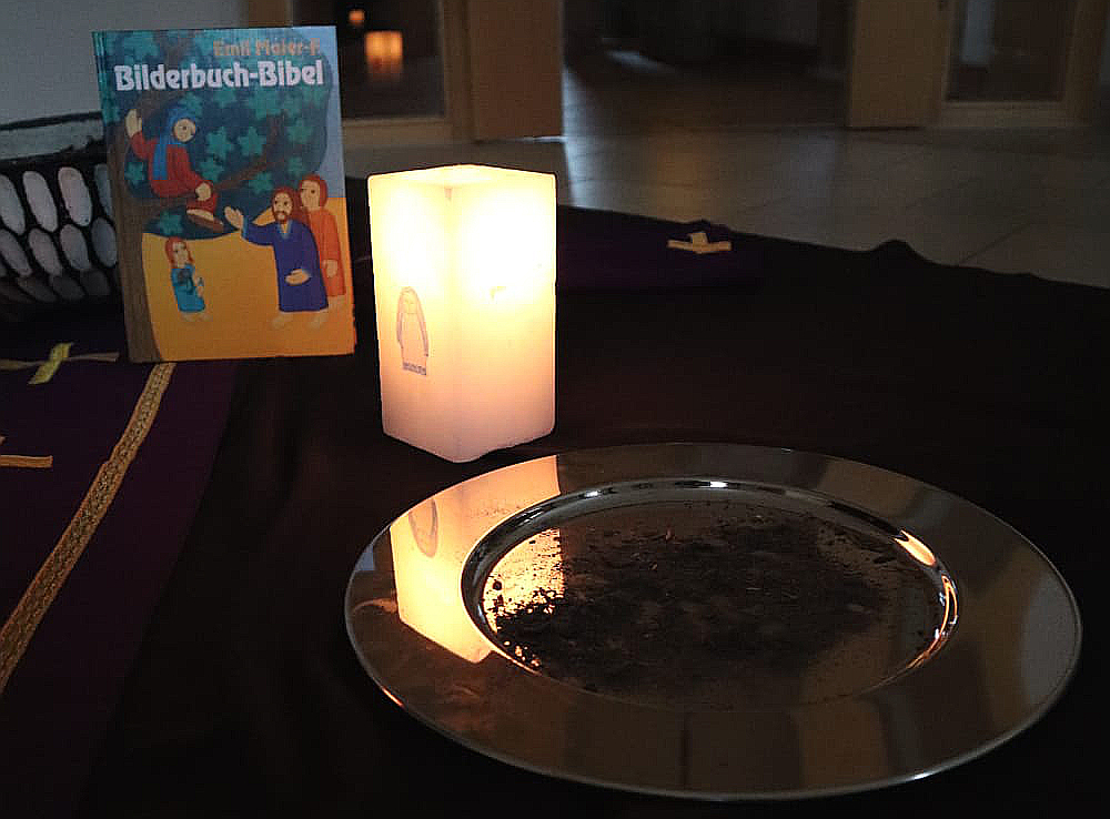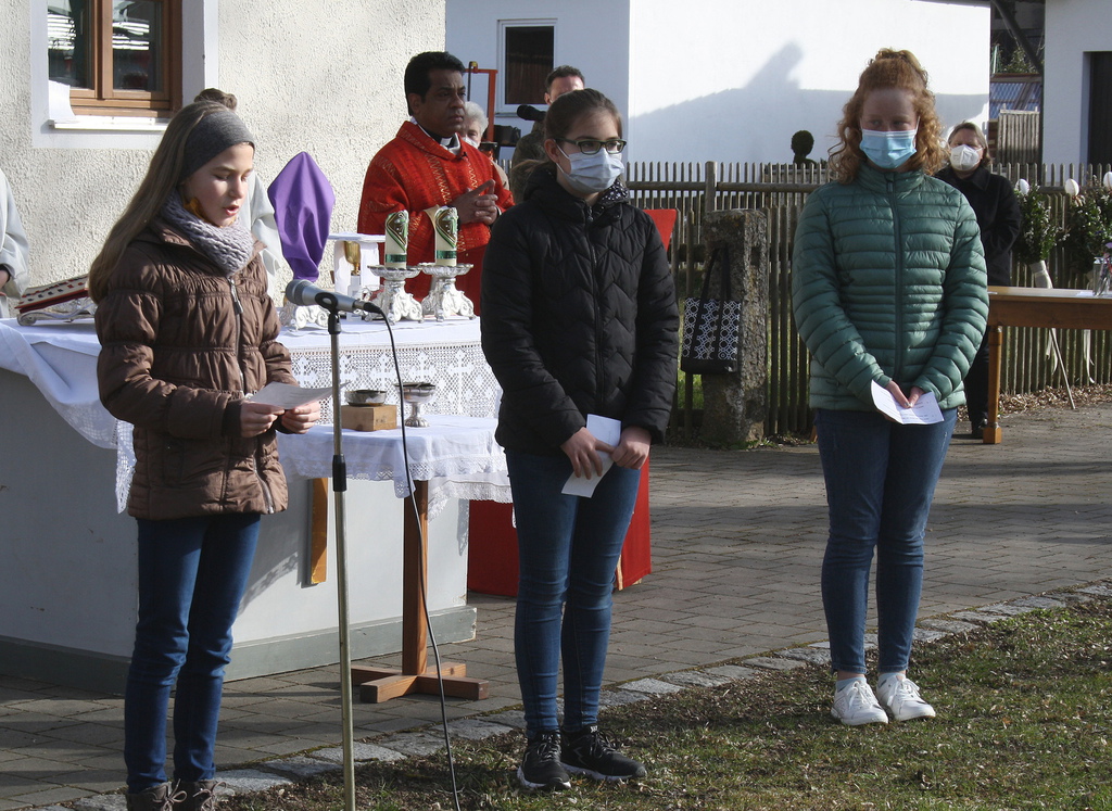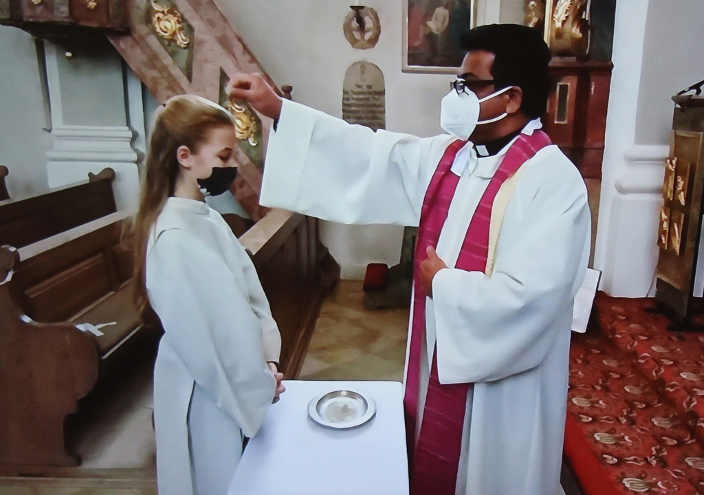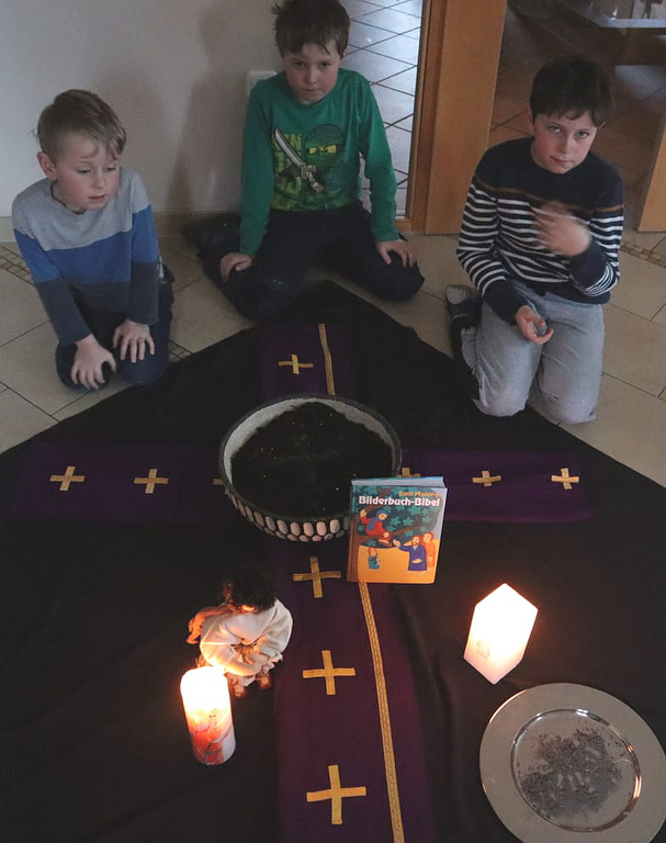 Zur virtuellen Kinderkirche per Videoschaltung hatten Stefanie Schuderer und das Liturgieteam der Pfarrgemeinde Wolfsbuch eingeladen. Auch Pfarrer Matthäus Luka übermittelte eine Videobotschaft und streute stellvertretend für alle Kinder zwei Ministranten das Aschenkreuz auf den Kopf.