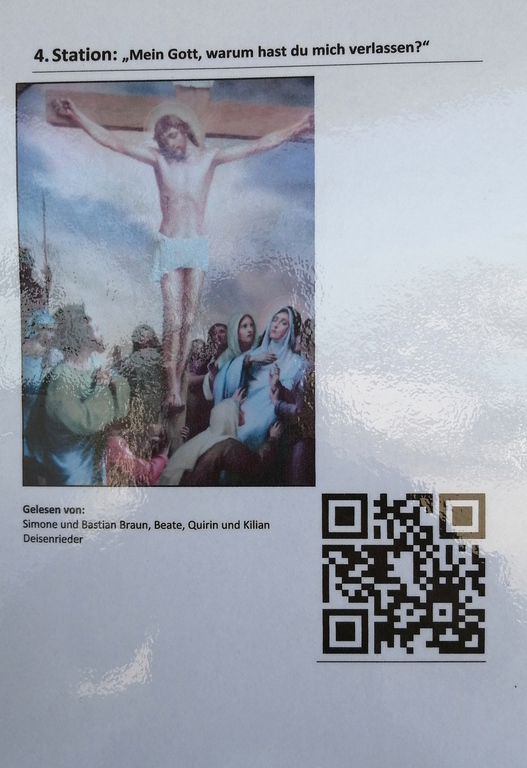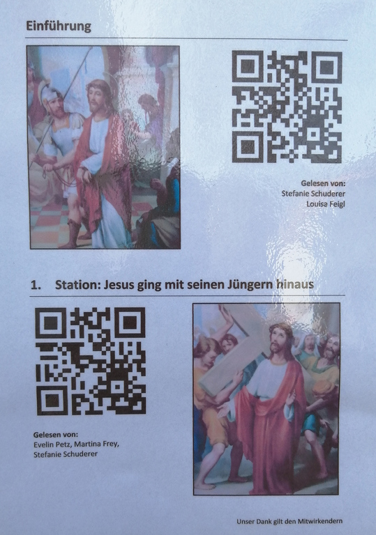 Die Mitglieder des Wolfsbucher Pfarrgemeinderates bieten in der Fastenzeit etwas ganz besonderes an - einen Kreuzweg mit QR-Codes. Die quadratischen Matrix der Codes sind an jeder der fünf Stationen angebracht. Sie können mit dem Smartphone gescannt und anschließend abgehört und angesehen werden. Hinter jedem dieser Codes, die bis zum Karsamstag funktionieren, steckt eine Kreuzwegstation .