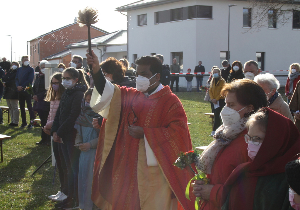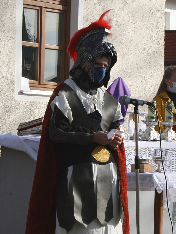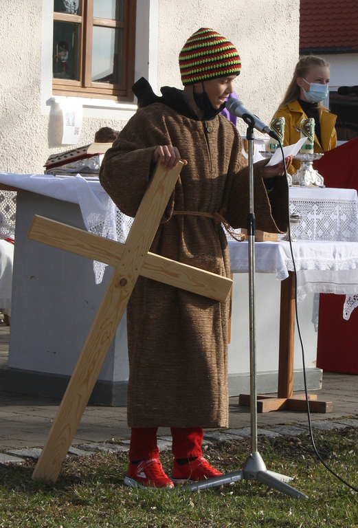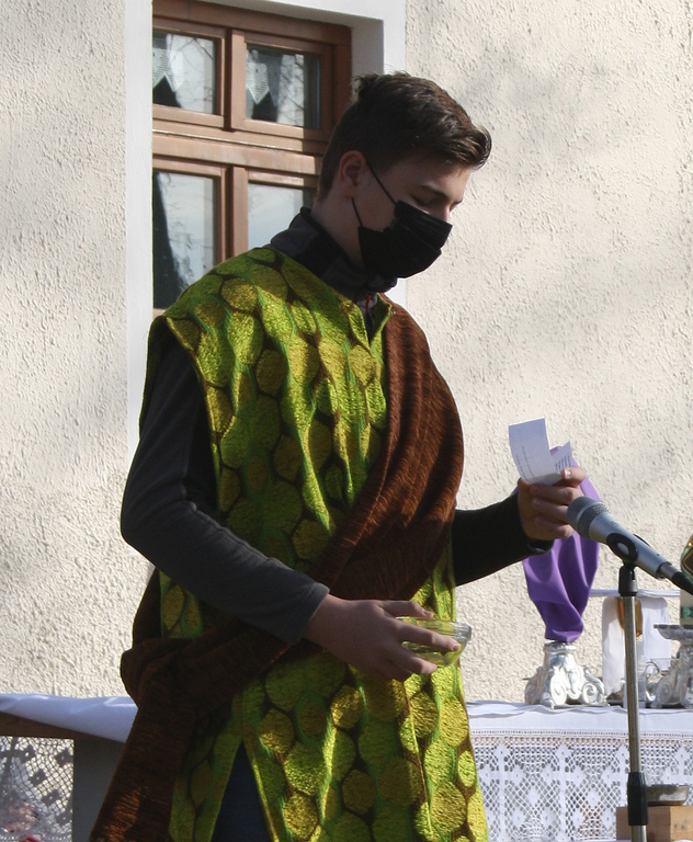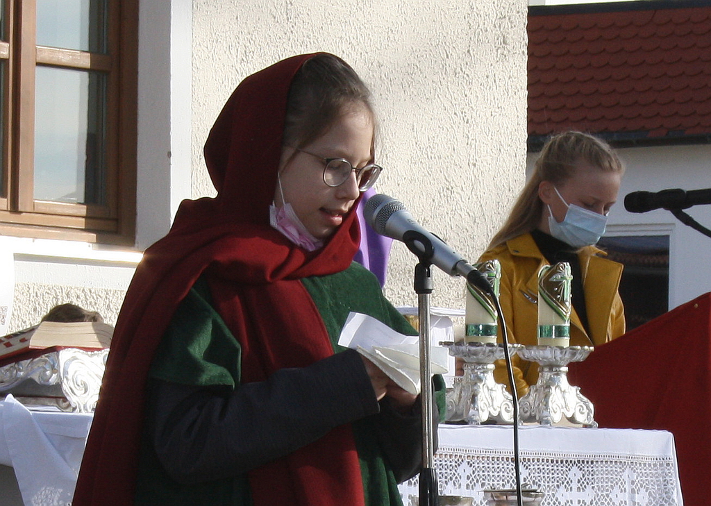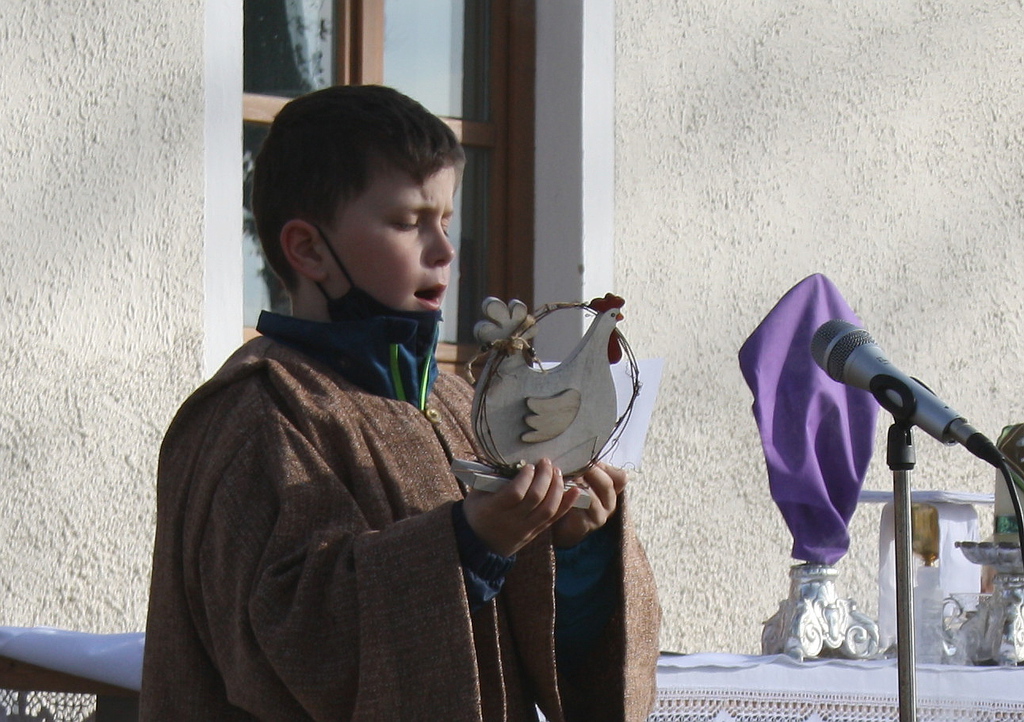 Unter strikter Einhaltung der Corona-Schutzmaßnahmen hat die Pfarrgemeinde Wolfsbuch am Palmsonntag im Pfarrgarten einen Familiengottesdienst abgehalten. Zum Eingang segnete Pfarrer Matthäus Luka die Palmbüschel. Die Kommunionkinder trugen dazu einige Gedanken vor. In einem kleinen Spiel schlüpften einige Kinder in die Rollen des Judas, des Hohenpriesters Kajaphas, des Petrus, des Barabbas, des Pilatus, eines römischen Soldaten, des Simon von Cyrene, der Veronika, des Johannes und der Maria. "Der Palmsonntag ist das Eingangstor zur Karwoche. Am Anfang dieser Woche steht das Hosianna - am Ende das 'Kreuzige ihn'", so der Ortsgeistliche in seiner Predigt. Dieses Geschehen von damals vollziehe sich, laut Pfarrer Matthäus, immer wieder neu in der Feier der heiligen Messe. Im Gottesdienst werde seine Lebenshingabe Wahrheit und Gegenwart. "Dafür können wir immer nur danken. Der Leidensweg Jesu ist auch unser Weg, an dessen Ende die Auferstehung steht", so der Geistliche abschließend. Am Ende des Familiengottesdienstes erhielten die Kinder als kleines Dankeschön für ihre Aufführungen Osterlämmchen. (Anton Patzelt)