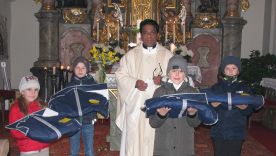Als sie die Buben und Mädchen fragte, was denn Nikolaus so Tolles gemacht habe, als er noch auf der Erde lebte, dass man sich immer noch an ihn erinnert, bekam sie eine spontane und ebenso überraschende Antwort. “Es hat gezaubert”, meldete sich ein Dreikäsehoch ohne lange zu überlegen zu Wort. Bei genauer Nachfrage stellte sich heraus, dass der Bub damit das Kornwunder meinte, das der Heilige der Geschichte nach in Myra vollbrachte. Anhand von Bibelfiguren spielten die Buben und Mädchen anschließend diese Szene noch einmal nach. Den Text dazu trugen Severin, Lisa, Matthias, Emma, Luis, Selina, Annalena und Louisa vor. „Bischof Nikolaus hat Menschen in Not geholfen. Lass uns nicht übersehen,wo wir anderen helfen können“, lautete eine der Fürbitten, die Felix, Julia und Johannes vor den Herrn brachten. „Dies kleine, geweihte Licht war eine Nacht bei mir - nun leuchte es in deinem Haus und teile seinen Segen aus“. Mit diesen Worten reichte Annalena das Friedenslicht weiter.