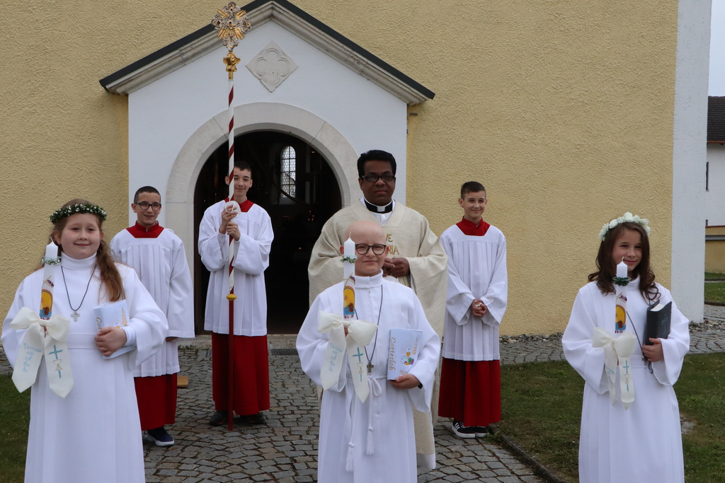 In den Fürbitten bauten einige Kinder Gott aus verschiedenen "lebendigen Steinen" die Grundmauer eines Hauses. Am Ende des Gottesdienstes segnete Pfarrer Matthäus die Kreuze und die Kommunionkleidung. Er überreichte sie an Annalena Braun, Quirin Deisenrieder, Philipp Frey, Emma Karg, Moritz Karg, Matthias Schuderer und Jonas Wolfsmüller, alle aus Wolfsbuch, sowie Lisa Bergmoser aus Breitenhill und Michael Pfaller aus Winden. Die Heilige Messe endete mit einem musikalischen Gruß an die Gottesmutter Maria.