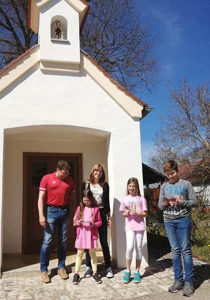 Start ist an der Marienkapelle unter dem Lindenbaum. Hier dürfen sich die Teilnehmer eine Wallfahrerkarte nehmen, in die an jeder Station verschiedene Symbole eingestanzt werden. "Wer am Ende alle Symbole gesammelt hat, darf sich über eine kleine Belohnung freuen", gibt die Pfarrgemeinderatssprecherin Stefanie Schuderer bekannt. "An deiner Hand" lautet das Motto der ersten Station. Die Erwachsenen vertrauen mit verbundenen Augen den Kindern, die sie führen. Die Kinder allein sorgen dabei für einen sicheren Halt. Über einen PR-Code kann das Lied "Gott ist mit uns unterwegs" auf dem Handy abgespielt werden. "Besondere Momente" schenken sich die Wallfahrer untereinander an Station Nummer zwei. In der Umgebung suchen die Teilnehmer Gegenstände, die ihnen besonders gut gefallen. Jeder erklärt anschließend, warum er gerade diesen Gegenstand ausgewählt hat. Dazu ertönt das "Kindermutmachlied".