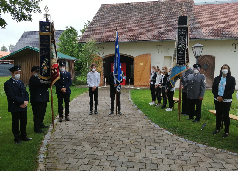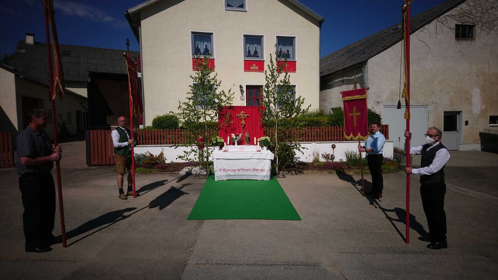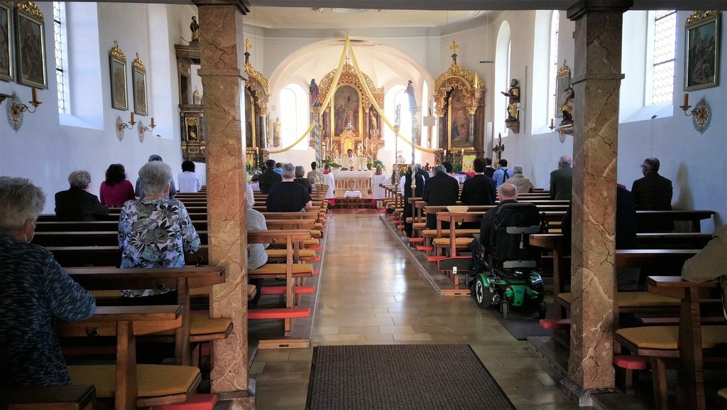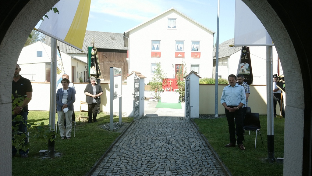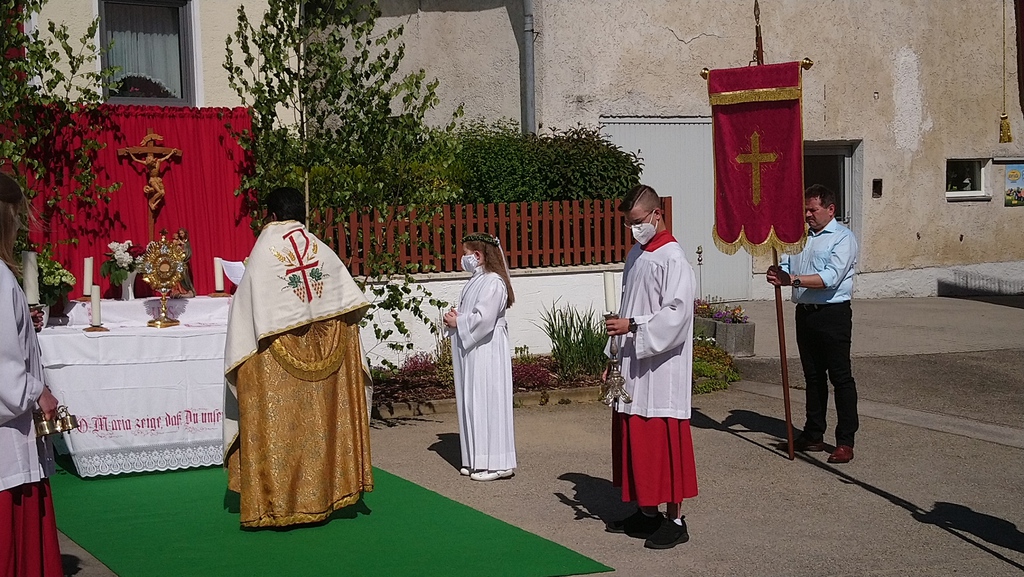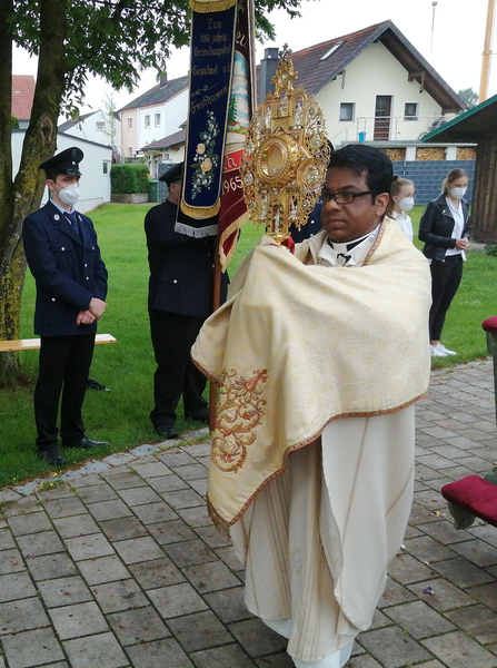 War es vor ein paar Jahren manchmal die Wetterlage, die eine Fronleichnamspro-zession verhindert hatte, so durfte man die letzten beiden Jahre wegen der Corona-Pandemie keine Prozession durchführen. Auf eine kleine Lösung verständigten sich Pfarrer Mathew Luka, die Mitglieder des Pfarrgemeinderates und der sonstigen kirchlichen Dienste. Auf dem Kirchenvorplatz wurde ein zusätzlicher Altar aufgebaut. Nur mit den Kommunionkindern und den Ministranten zog der Priester mit der Monstranz zu diesem Altar aus. Die Kirchenfahnen der Filialkirchen hatten bereits ein Spalier gebildet und auch die Pfarreivereine waren mit ihren Fahnen anwesend und säumten eine Reihe an der Kirchenmauer mit gebührendem Abstand. „Wir feiern heute ein großes Fest unseres Glaubens“, eröffnete Luka den Gottesdienst. „Jesus ist mitten unter uns, gerade in dieser schweren Zeit der Pandemie. In der Eucharistie kommt uns der Himmel sehr nah und nach der Kommunion ist jeder eine lebendige Monstranz. Wir werden zum Tabernakel. Jeder macht seine eigene Prozession und bringt das Wort Gottes unter die Leute“. In der Predigt wies der Geistliche darauf hin, dass 2021 wohl ein besonderes Jahr sei. Weihnachten, Ostern und Pfingsten konnten die Christen mit Abstand in den Kirchen feiern. Auch das Fronleichnamsfest als Erinnerung an das letzte Abendmahl Jesu darf man gemeinsam begehen. „Alles dreht sich um ein kleines Stück Brot. Dieses Lebensmittel hat sich Jesus erwählt, um ständig bei uns zu sein.“ Luka erzählte dazu auch eine Geschichte aus Amsterdam. Vor langer Zeit war es verboten, mit der Monstranz durch die Stadt zu ziehen. Die Menschen kauften sich einen neuen Anzug oder neue Kleider und gingen am Morgen des Fronleichnamstages zum Gottesdienst. Anschließend zogen sich gleichsam einer lebendigen Monstranz durch die Straßen. Auf den vier Stationen des kurzen Prozessionsweges wurden in den Texten und Evangelien die Lebensabschnitte der Menschen näher beschrieben. Vom Lebensanfang, der Jugendzeit, dem Erwach-sensein und dem Alter handelten die verschiedenen Stellen aus der Heiligen Schrift. „Viele Vorbereitungen waren nötig, um das Fronleichnamsfest in dieser Form zu gestalten“, sagte Luka am Ende des Gottesdienstes. „Vielen Dank für die Mühen“. Luka bedankte sich bei allen Gottesdienstbesuchern, Mesnerin Inge Kammerl, den Ministranten, dem Kirchenchor unter der Leitung von Wolfgang Fronek und den Pfarreivereinen, die mit ihren Vereinsfahnen gekommen waren. (Bernhard Meyer)