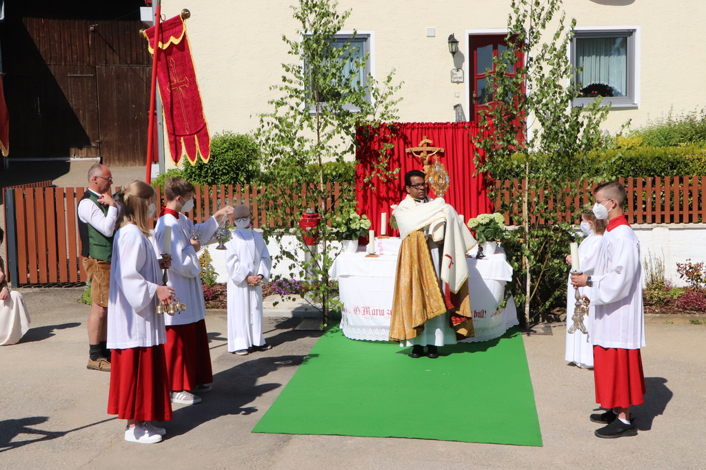 Dass Gott für uns immer da ist, auch in den nicht ganz einfachen Zeiten der Corona-Pandemie, betonte Pfarrer Matthäus auch in seiner Predigt. "Wir müssen nur unsere Augen und Ohren öffnen, für alle Dinge, die unser Leben reich machen. Und wir müssen nur unsere Herzen öffnen, für den göttlichen Willen, damit das Miteinander reicher wird", rief der Ortsgeistliche den Gottesdienstbesuchern zu. Die einzelnen Fürbitten brachten Philipp, Lisa, Quirin und Annalena vor den Herrn. Die Heilige Messe endete mit dem liturgischen Segen zum Fronleichnamsfest.