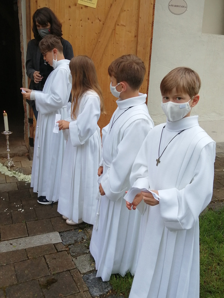 Erstmals an den Tisch des Herrn traten am Sonntag in der Wolfsbucher Andreaskirche drei Buben und ein Mädchen. Um die Corona-Regeln einzuhalten, wurde der feierliche Gottesdienst via Livestream auf den Vorplatz der Kirche übertragen. Die Erstkommunion stand unter dem Motto "Vertrau mir, ich bin da".