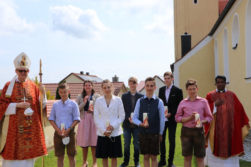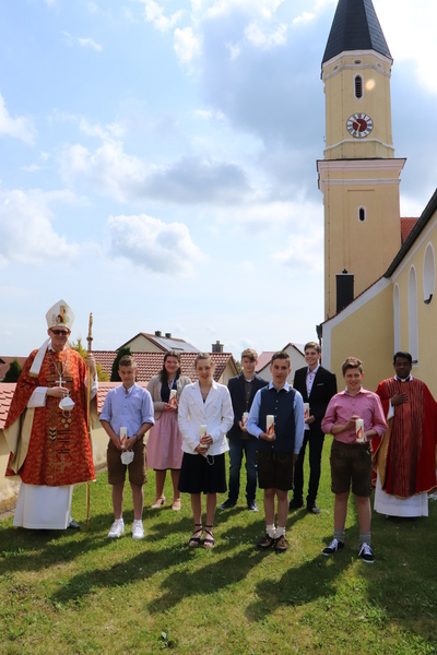 "Schön, dass Sie an die Heimat denken und uns das Sakrament der Firmung schenken", so lautete die Begrüßung der Firmkinder an Weihbischof Dr. Josef Graf. Aber nicht nur die Firmlinge, auch der Firmspender freute sich seine Landsleute firmen zu dürfen. Unter den Motto "Leinen los" bereiteten Sich die Jugendlichen bereits im letzten Jahr auf die Firmung vor, die Coronabedingt leider 2020 nicht stattfinden konnte. So wurden am 05.06.2021 im Festgottesdienst um 9.00 Uhr in Pondorf sieben Jugendliche gefirmt. Danach ging es für den Weihbischof gleich weiter nach Schamhaupten, denn auch hier erhielten 17 junge Christen in der Pfarrkirche St. Georg die Firmung.