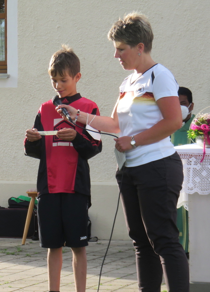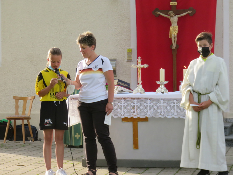 Gleich beim Einlauf in das Stadion des Pfarrgartens erhielten die gelb-schwarz gekleideten Spieler und Spielerinnen den Beifall der Gottesdienstbesucher. Zu Beginn der Heiligen Messe stellte Severin fest, dass Pfarrer Matthäus ebenfalls eine Art Trikot trage: "Durch sein schwarzes Messgewand merkt man sofort , er gehört er zu einer ganz besonderen Mannschaft - zur Mannschaft Gottes". Aber auch allen anderen sollte man an den Taten erkennen, dass sie zum Team Gottes gehören und "Fans des Herrn" sind. Leider werde viel zu oft vergessen, dass man in diesem Team spielt. Zum "Fairplay" rief Felix in seinem Kyrie-Ruf auf. Danach gingen die Kinder näher auf die einzelnen Aufgaben der Spieler ein und brachten diese mit der christlichen Gemeinschaft in Verbindung. "In der Fußballmannschaft müssen wir hart trainieren und um jeden Ball kämpfen",meinte Philipp und Quirin entgegnete: "Ja, auch wir Christen müssen uns darin üben,das Gute zu tun und das Böse zu unterlassen. Dafür trainieren wir in jedem Gottesdienst". Ganz wichtig sei der Teamgeist. Keiner spiele für sich allein, sondern für den anderen - für die ganze Mannschaft. Auch Pfarrer Matthäus ging in seiner Predigt auf den Teamgeist ein: "Einer für alle, alle für einen. Das gilt für Sportmannschaften und für uns Christenmannschaft ganz besonders. Keiner soll im Stich gelassen werden. Starke Mannschaftsmitglieder tragen die schwachen".