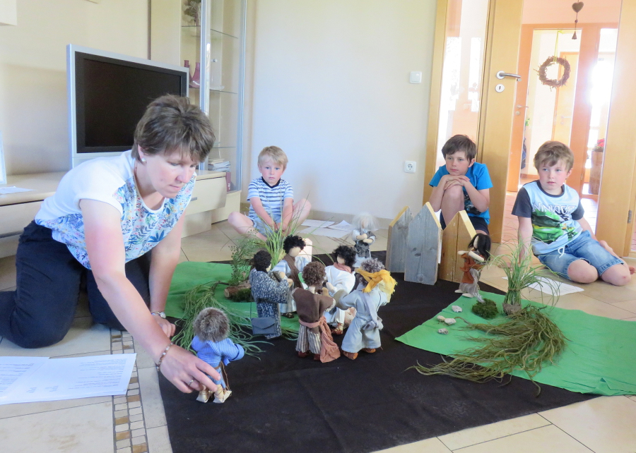 Der Kinderkirche im Wolfsbucher Pfarrgarten unter der Leitung von Stefanie Schuderer lag diesmal das Leitwort "Familie" zugrunde. Zunächst betrachteten die Kinder ein Bild von der Heiligen Familie. "Damals war vieles ähnlich wie bei euch zuhause. Die Mama hat das Jesuskind an der Handgenommen und geführt. Sein Papa hat ihm gezeigt, wie man Stecken schnitzt. Wenn der kleine Jesus traurig war, hat er sich von Mama trösten lassen. Und wenn er Angst hatte, ist er zu Papa gelaufen. Sie haben miteinander gelacht und geweint, sich geärgert und auch wieder vertragen - eben, wie eine ganz normale Familie", erzählte Schuderer.
