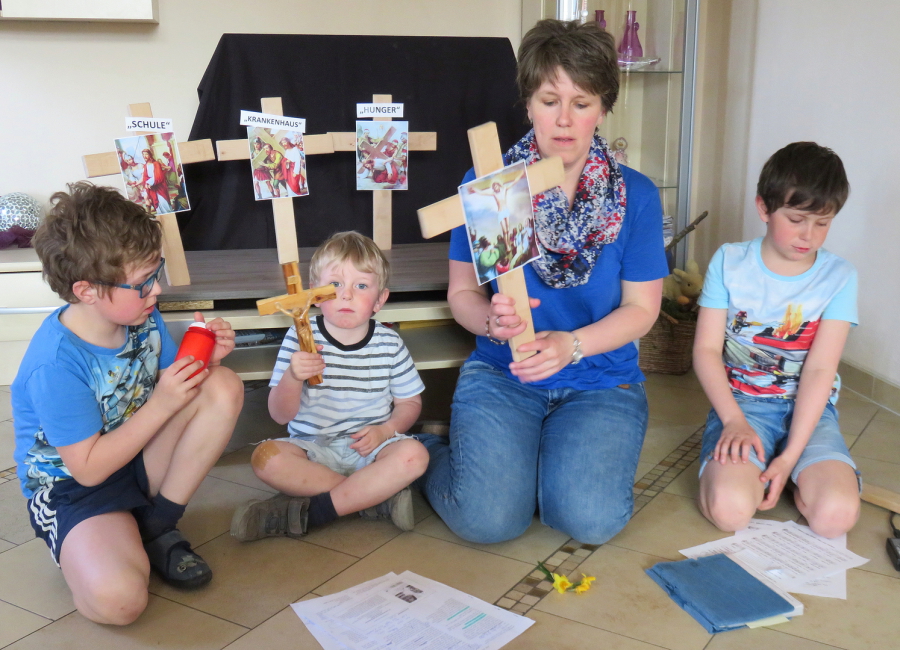 Nach dem Kreuzweg ist auch die erste Kinderkirche via Zoom-Videoübertragung des Wolfsbucher Liturgieteams unter der Leitung von Stefanie Schuderer zum Thema "Lasset die Kinder zu mir kommen" ausgezeichnet angekommen. Insgesamt nahmen 15 Familien mit rund 30 Kindern daran teil. Die Technik lag wieder in den Händen von Benedikt Stijns und für die musikalische Umrahmung sorgte Simone Braun auf der Gitarre.