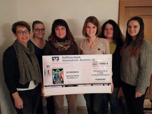 Der Erlös aus dem diesjährigen Adventssingen in Pondorf in Höhe von EUR 1.500 wurde an Frau Ingrid Geisenfelder übergeben. Diese stattliche Summe konnte Dank der Katholischen Landjugend Pondorf, die den Gewinn aus dem Glühweinverkauf spendete, erreicht werden. Frau Geisenfelder ist 1. Vorsitzende von Siyabonga und wird mit der Spende ihr Projekt in Afrika unterstützen. Sie dankte bei der Übergabe allen Spender/innen für die Unterstützung. Wer weiters über die Spendenorganisation oder über Patenschaften wissen möchte, kann sich auf der Homepage von Siyabonga informieren.